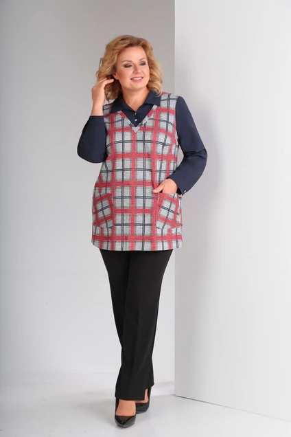 Туника-имитация (жилет+блуза) из трикотажной ткани. Рукава и воротник выполнены из блузочной ткани темно-синего цвета. На передней полочки имеются 2 больший накладных карманов. В боковых швах есть разрезы, длиной 18 см. Длина туники от верхней точки плеча 76 см для 56-60р и 78 см для 62-66р. Длина рукава 59 см.