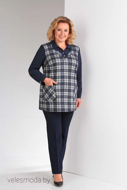 Туника-имитация (жилет+блуза) из трикотажной ткани. Рукава и воротник выполнены из блузочной ткани темно-синего цвета. На передней полочки имеются 2 больший накладных карманов. В боковых швах есть разрезы, длиной 18 см. Длина туники от верхней точки плеча 76 см для 56-60р и 78 см для 62-66р. Длина рукава 59 см.