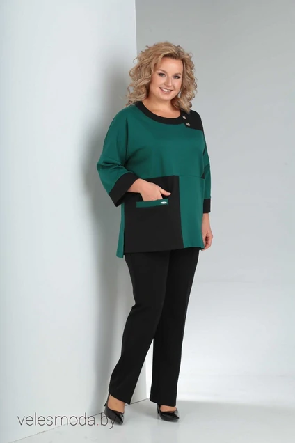 Туника из трикотажного полотна.Туника скомбинирована из двух цветов,имеет свободный силуэт ,рукав с заниженной проймой и притачной манжетой.Справа на передней полочке имеется функциональный карман.В качестве декора используются пуговицы и украшение на кармане под метал.Длина туники по центру спинки 78см. длина рукава от горловины 61см.