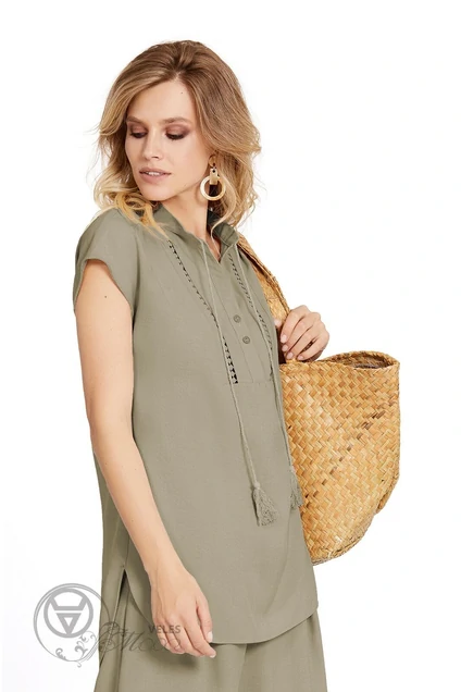 Туника из текстильной ткани с воротником-стойкой и фигурной кокеткой с кружевом. Детали: спущенная линия плеча, перед с кокеткой и отрезными планками, застежка на петли и пуговицы, фигурный низ переда и спинки разной длины