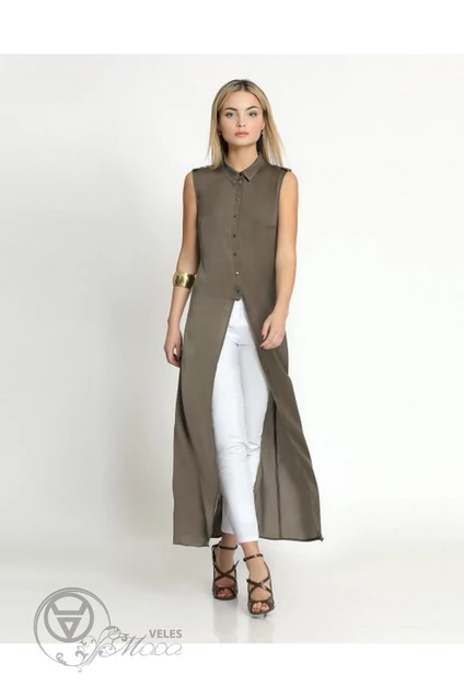 Длинная туника из легкой, струящейся ткани. С отложным воротником на отрезной стойке. Без рукава. С застежкой по переду на планке до линии талии на петли- пуговицы. С погонами. По спинке кокетка. 44 Туника: Длина изделия - 133см, Ширина плеча - 11,5см, Ширина по бедрам - 53см, Ширина по груди - 50см 46 Туника: Длина изделия - 133см, Ширина плеча - 11,5см, Ширина по бедрам - 55см, Ширина по груди - 52см 48 Туника: Длина изделия - 133см, Ширина плеча - 12см, Ширина по бедрам - 57см, Ширина по груди - 54см