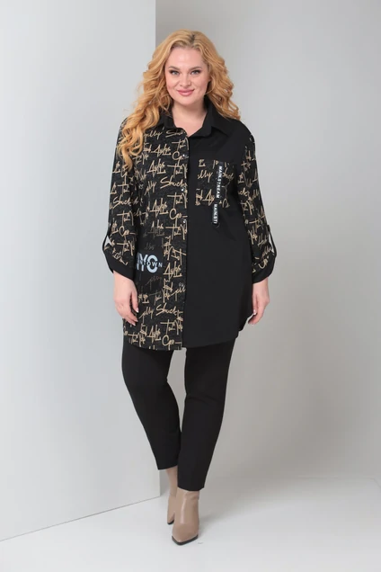 Эффектная туника рубашечного типа, с фигурным низом по бокам. Классического, свободного прямого силуэта, с центральной сквозной застежкой на 6 петель и 6 пуговиц и 1 петлю и пуговицу на стойке воротника. Выполнена из мягкого трикотажа с добавлением вискозы. Воротник рубашечного типа. Линия плеча приспущена, рукав втачной, на пате с петлей-пуговицей. Накладной карман с декоративным принтом расположен на полочке с левой стороны. Спинка цельная. В боковых швах функциональные карманы. Низ изделия декорирован элементом из сетки. Прекрасный выбор для весеннего гардероба в сочетании с брюками и джинсами. Длина изделия по спинке 88 см. Длина рукава 55 см.