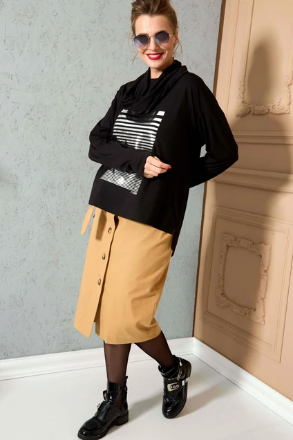 Стильный блузон из вискозного трикотажа. Авторская печать. Свободный фасон. Шарф-хомут. Асимметрия по низу изделия. Длина изделия по переду 69, по спинке 74
