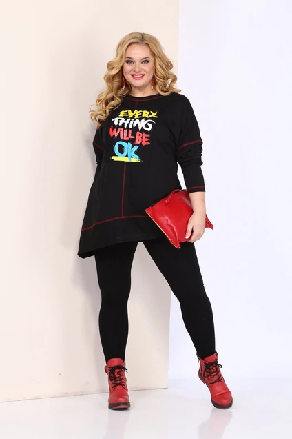 Туника женская свободного силуэта расширенная к низу изготовлена из трикотажного полотна на х/б основе с хорошим стрейчем. Горловина округлой формы обработана притачной планкой. Линия плеча спущенная, рукав длинный. В правом боковом шве функциональный карман. Линия низа асимметричная. По центру полочки декоративный настрочной элемент, в цвет которого сделаны отделочные строчки. Надпись на нашивке переводиться с английского « Не беспокойся, все будет хорошо». Ткань очень приятная к телу, фасон современного спортивного стиля. Широкий размерный ряд позволит удовлетворить большое количество покупателей.