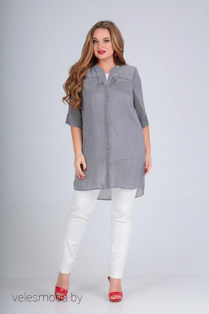 Туника дополнена топом из белого текстиля. Топ с рельефами по переду, разрезами в боковых швах и окантованными косой бейкой проймами и горловиной.