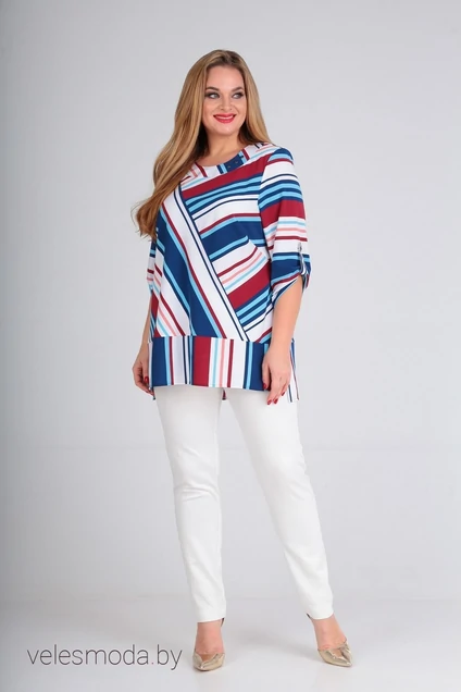 Туника женская свободного силуэта с втачными одношовными рукавами. Имеется пата для регулировки длины. Горловина округлой формы. Обработана широкой притачной планкой с тремя пуговицами, как украшение. Деталь переда отрезная по диагонали, от плеча до низа, и нагрудными вытачками из бокового шва. Спинка также отрезная по диагонали, с застежкой в верхней части на навесную петлю и пуговицу. По низу изделия широкая притачная деталь с разрезами в боковых швах. Перед короче спинки на 3 см. Динамику изделию придают декоративно-конструктивные элементы с разнонаправленным положением полоски.