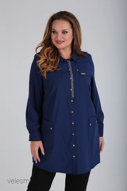 Туника женская прямого силуэта с центральной застежкой на петли и пуговицы, и одну петлю-пуговицу на воротнике. Рукава втачные одношовные с притачными манжетами, застегивающимися на 2 петли и пуговицы. По швам притачивания манжет закладываются по 2 односторонние складки. Для регулировки длины рукава имеется пата, которая фиксируется на петлю и пуговицу. Перед с нагрудными вытачками от проймы , накладными карманами с отворотом на 2 пуговицы и настрочными клапанами выше линии груди. Спинка с горизонтальной кокеткой выше линии лопаток. Воротник рубашечного типа на притачной стойке. По низу боковых швов – разрезы. Декоративным элементом является настрочная декоративная тесьма на планке.