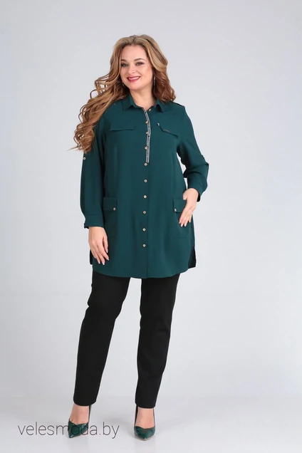 Туника женская прямого силуэта с центральной застежкой на петли и пуговицы, и одну петлю-пуговицу на воротнике. Рукава втачные одношовные с притачными манжетами, застегивающимися на 2 петли и пуговицы. По швам притачивания манжет закладываются по 2 односторонние складки. Для регулировки длины рукава имеется пата, которая фиксируется на петлю и пуговицу. Перед с нагрудными вытачками от проймы , накладными карманами с отворотом на 2 пуговицы и настрочными клапанами выше линии груди. Спинка с горизонтальной кокеткой выше линии лопаток. Воротник рубашечного типа на притачной стойке. По низу боковых швов – разрезы. Декоративным элементом является настрочная тесьма на планке и петля из этой же тесьмы на левом клапане.
