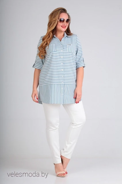 Туника женская свободного силуэта с втачными одношовными рукавами. По низу обработаны притачными манжетами на 1 петлю-пуговицу, для регулировки длины имеется пата. Воротник рубашечного типа на притачной стойке. Вырез горловины фигурный, переходящий в центральную застежку на петли и пуговицы. Детали переда с нагрудными вытачками, выходящими из проймы, и накладными карманами по линии груди. Спинка цельная. По нижней части переда и спинки имеются горизонтальные членения с разнонаправленным положением полоски.
