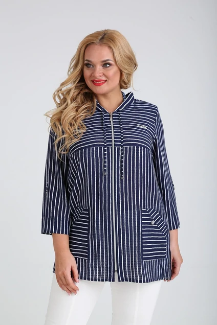 Туника женская свободного силуэта с втачными одношовными рукавами. По низу рукав обработан широкой подгибкой, для регулировки длины имеется пата. Вырез горловины обработан капюшоном с кулисой и шнуром. Центральная застежка- «молния». Детали переда – отрезные по линии груди, с накладными карманами со скошенным углом. Спинка со средним швом. По низу боковых швов - разрезы.