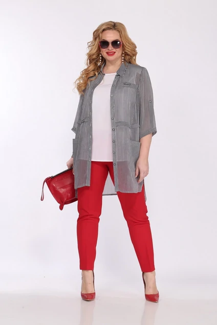 Комплект-двойка. Туника женская прямого силуэта, с втачными одношовными рукавами. Для регулировки длины рукава имеется пата с пуговицей. Перед отрезной по линии талии, с нагрудными вытачками из проймы, накладными карманами и накладной листочкой. Воротник рубашечного типа на притачной стойке. Застежка центральная, на притачных планках. Спинка отрезная по линии выше лопаток. По низу боковых швов обработаны разрезы.