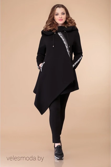 Туника женская с длинным втачным рукавом. По спине аппликация. По переду запах на молнии. Обработаны прорезные карманы с листочкой. По горловине капюшон на кулиске. Рукава, карманы и полочка декорированы тесьмой. Низ переда туники асимметричный.