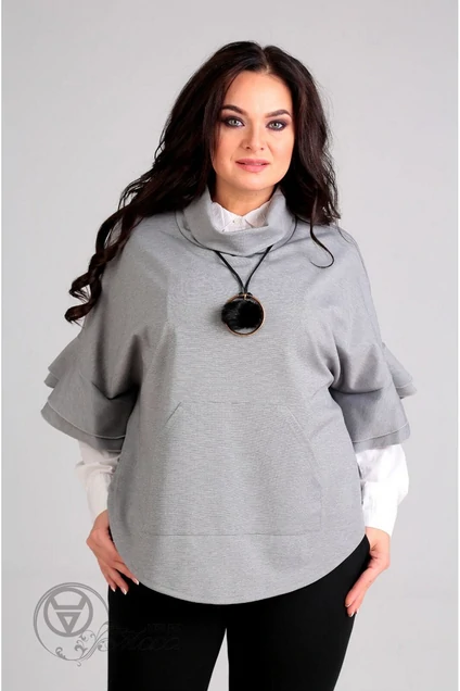 Туника женская, свободного покроя, со спущенной линией плеча. Низ изделия полукруглой формы. По центру переда настрочен карман-кенгуру. Воротник-стойка двойной, с центральным швом по спинке, выкладывается наружу хомутом. По проймам пришиты двойные воланы, обработанные мелкой обметкой. М 62261 48 50 52 54 56 58 Длинна спинки, (см) 58 58 58 65 65 65 Ширина спинки, (см) Ширина под проймой, (см) ПОГ 74 74 74 81 81 81 Ширина по бедрам, (см) Длина плеча с воланом, (см) 43 43 43 45 45 45 Длина полочки, (см) 56 56 56 63 63 63 Ширина рукава под 48 48 48 58 58 58 проймой (обхват) (см)