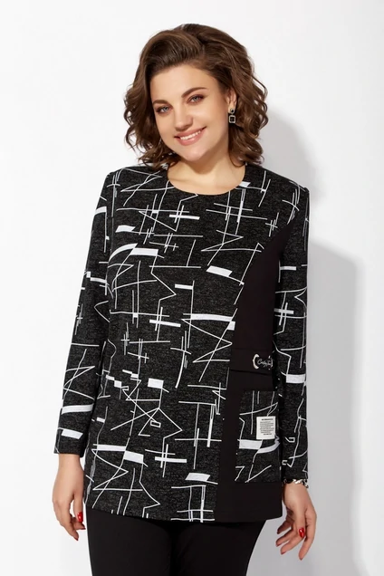 Туника прямого силуэта, изготовленная из мягкого и приятного на ощупь трикотажа, отличается длинами рукавами и округлым вырезом горловины, который нежно обрамляет шею, подчеркивая её линию. Геометрический принт, который украсил однотонную часть ткани, придаёт модели особый шарм и уникальность, создавая интересные визуальные акценты. Этот дизайн не только привлекает внимание, но и эффективно скрывает небольшие недостатки фигуры, создавая иллюзию стройности. Туника легко комбинируется с разными низами, позволяя создавать множество стильных образов.