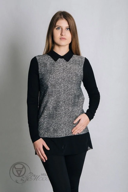 туника женская Туника свободного силуэта цельнокроенного покроя со спущенным плечом, комбинированная длиной до середины бедра.