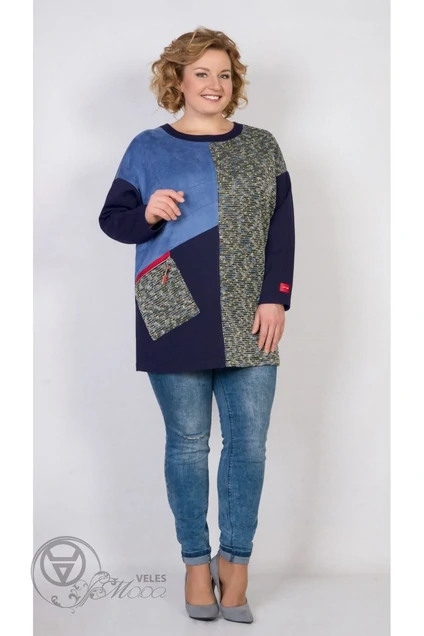 Туника прямого силуэта, изготовлена из трех видов ткани. Полочка с декоративными сечениями. Накладной карман с декоративной молнией. Спинка выполнена из ткани переда - букле. Длина изделия - 75 см.