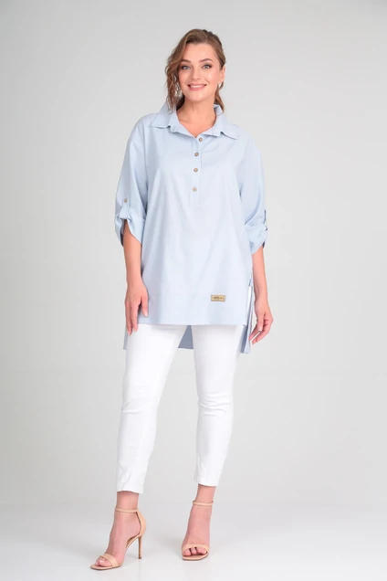 Туника женская рубашечного покроя, свободного силуэта оверсайз, выполнена из тонкого льна. Воротник отложной рубашечный на стойке. От воротника по центру не доходя до линии талии - притачная планка с петлями и пуговицами. По переду нагрудная вытачка, идущая от линии талии. Линия плеча спущена. Рукав втачной с квадратной проймой, с манжетой и патой. По бокам глубокие разрезы, которые фиксируются патой с пуговицей. Линия низа оформлена широким манжетом. Спинка длиннее переда на 8 см. Длина спинки во всех размерах 81 см Ширина изделия на уровне глубины проймы в 46р - 60 см , 48р-62 см , 50р-64 см, 52р-66 см. Длина рукава с плечом 56 см. Ширина рукава 27 см