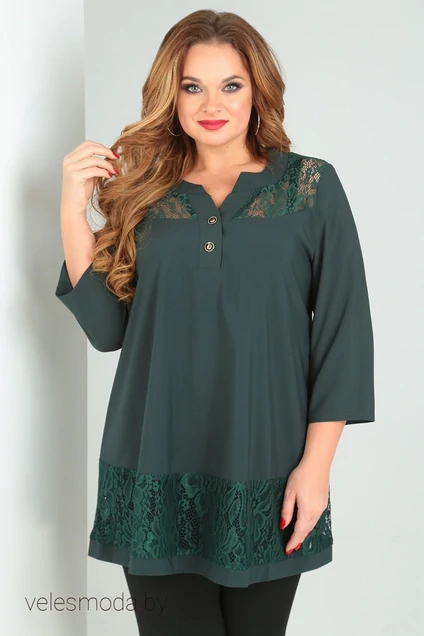 Чудесная нарядная туника изумрудного цвета из тончайшего шелковистого трикотажа А-силуэта, с трехчетвертным рукавом, с оригинальным воротом с пуговками, декорирована кружевными элементами. В этой тунике вы будете в центре внимания на любой вечеринке. Длина 79 см