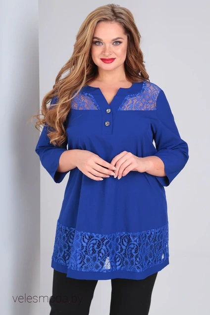 Чудесная нарядная туника василькового цвета  из тончайшего шелковистого трикотажа А-силуэта, с трехчетвертным рукавом, с оригинальным воротом с пуговками, декорирована кружевными элементами. В этой тунике вы будете в центре внимания на любой вечеринке. Длина 79 см