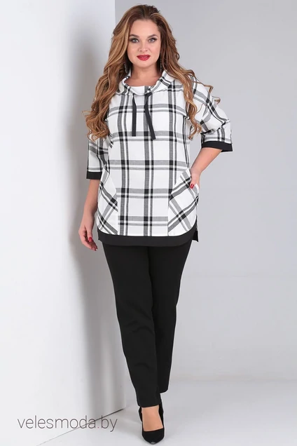 Эффектная клетчатая блузка-туника из качественной вискозы удлиненная ,с трехчетвертным рукавом ,с оригинального кроя воротником, декорирована накладными карманами. Эта туника за счёт своего кроя очень стройнит силуэт и может удачно комплектоваться не только с джинсами, но и с классическими чёрными брюками и чёрной юбкой-карандаш.