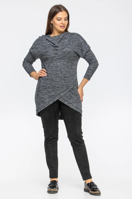 Повседневная женская туника прямого силуэта, из трикотажного полотна "меланж", с удлиненным рукавом. Перед туники состоит из двух деталей на запах с прорезными карманами "в рамку". Горловина округлой формы. Спинка цельная, рукава втачанные, с удлиненным плечевым поясом. Туника слегка прикрывает бедра. Длинна по спинке 91 см.