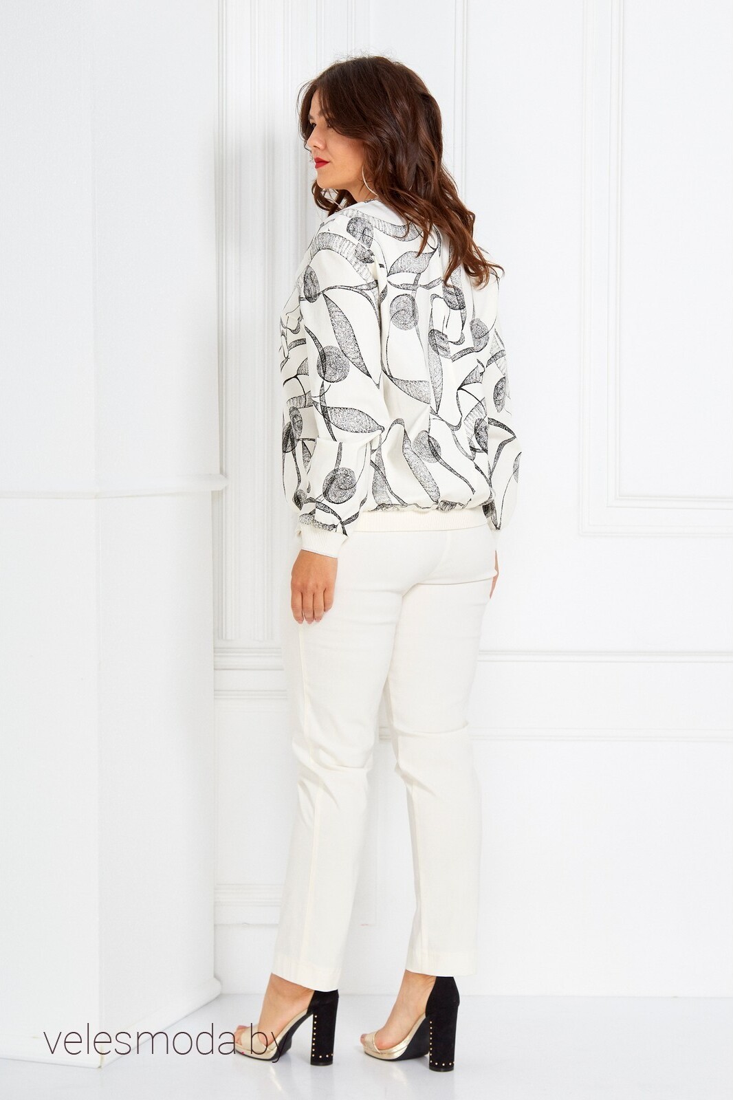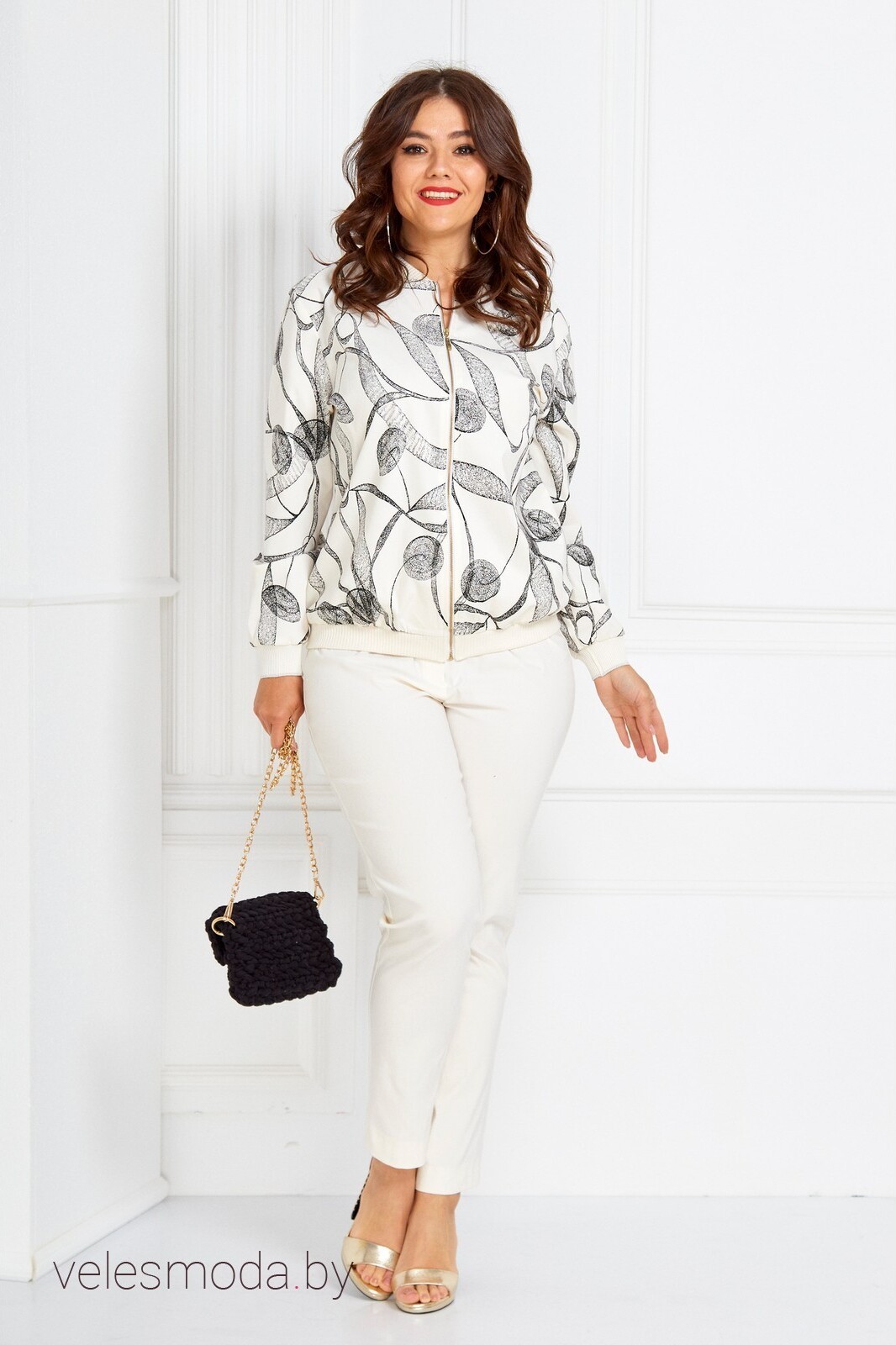 Бомбер женский из текстильной ткани: на молочной основе листья. Рукав длинный , одношовный, втачной. В горловину овальной формы вставлен воротник из довяза. По низу бомбера и низу рукава довяз. По переду застежка молнию. Длина бомбера (с поясом): (50-54)-62 . Длина рукава (с манжетой): (50-54)-61см., (56-60)-62см.