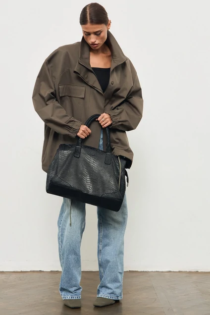 Куртка из хлопковой ткани, большого объема, со спущенной линией плеча. По переду накладной карман, застежка на молнию и приточную планку на пуговицах. Рукав одношевный, низ обработан эластичной тесьмой. По низу куртки кулиса с декоративным шнурком. Воротник стойка.