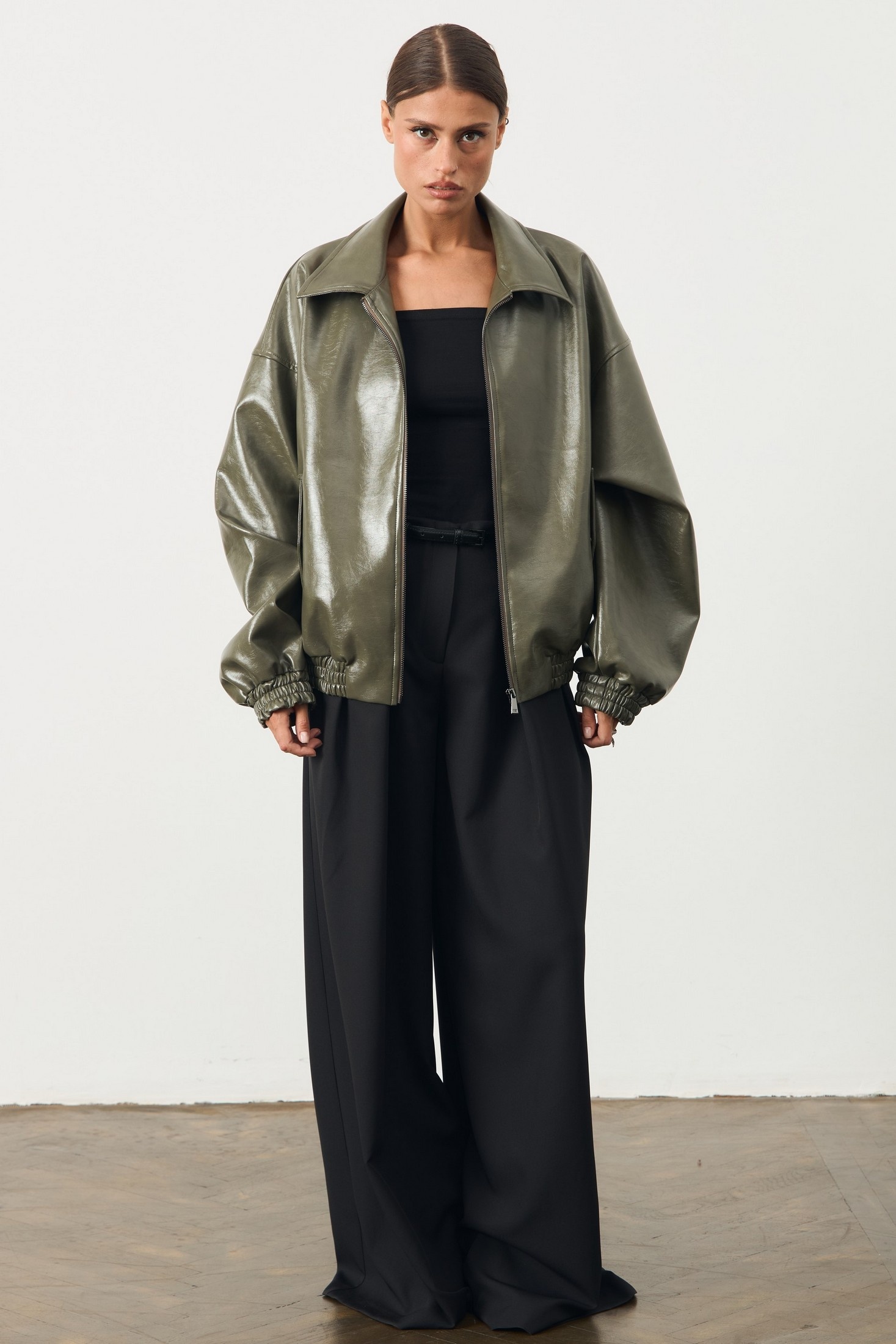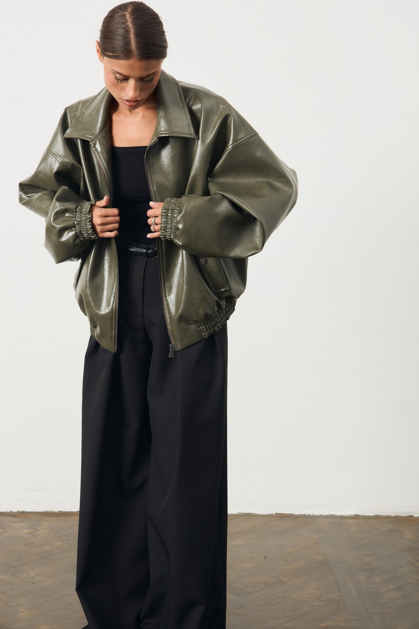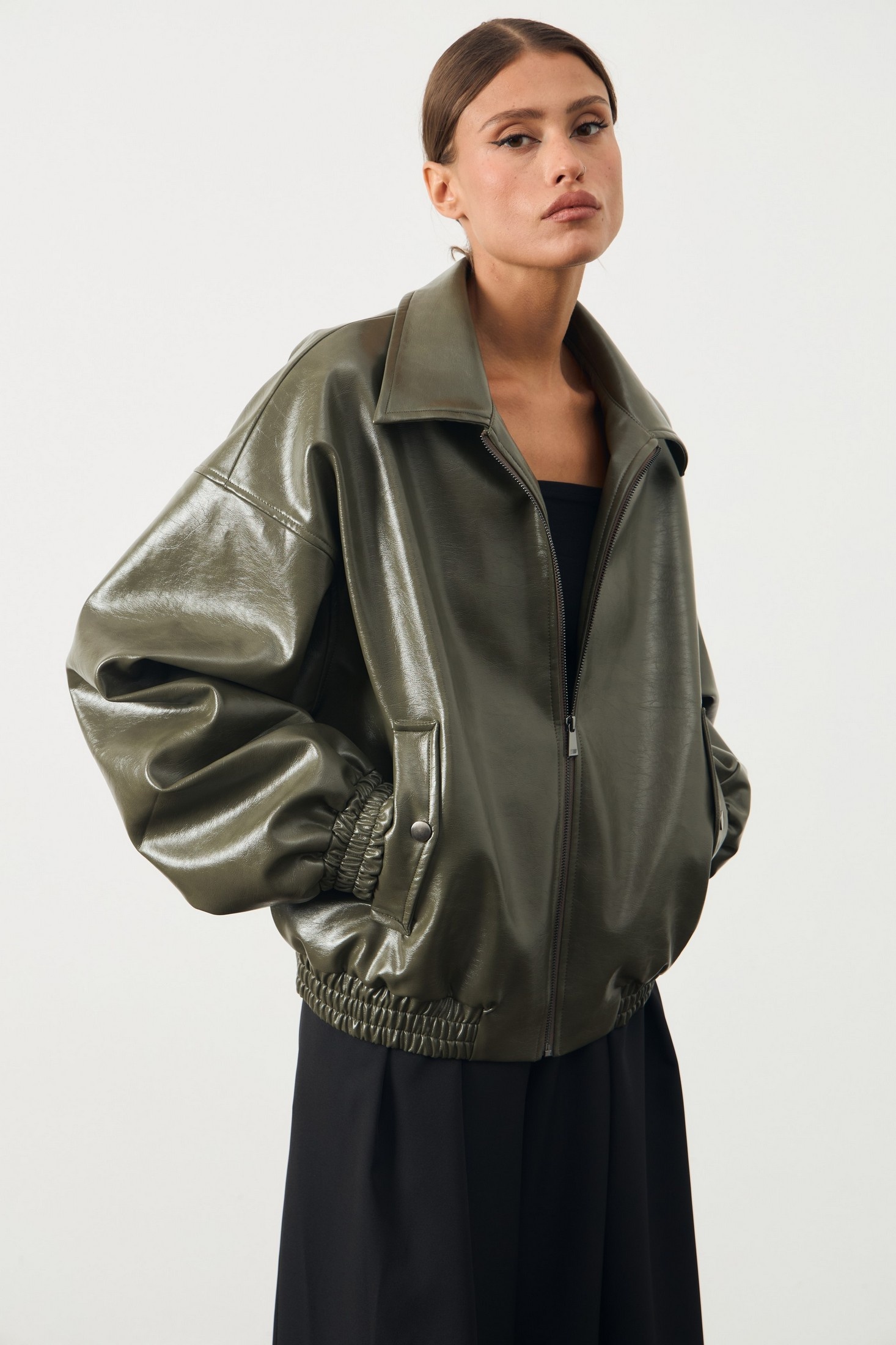 Куртка прямого силуэта из экокожи. По переду куртки прорезные карманы с клапанами. На спинке кокетка. Воротник рубашечного типа. Рукав широкий с манжетой на резинке. Низ изделия обработан притачным поясом на резинке. Застежка-молнния.