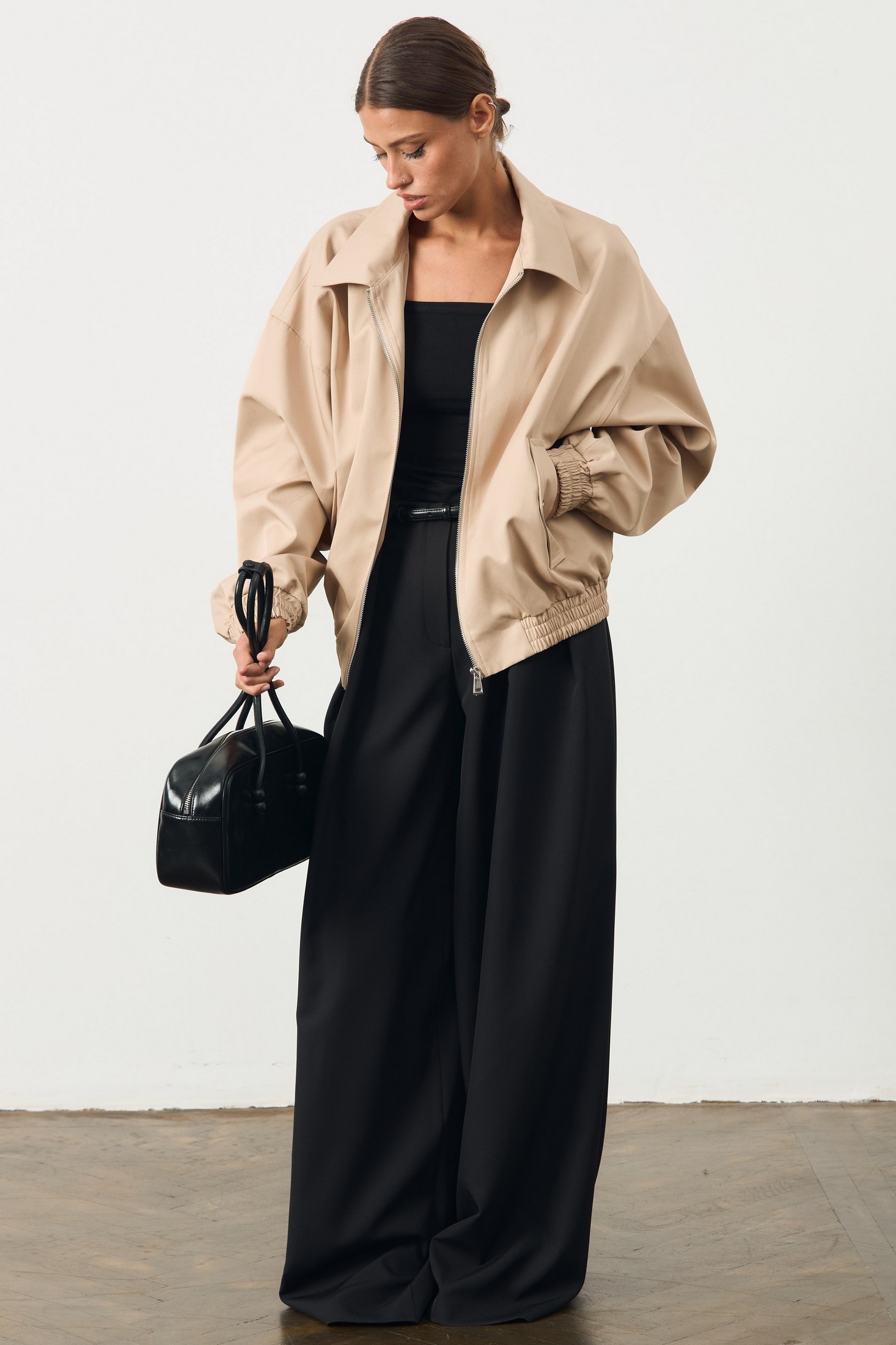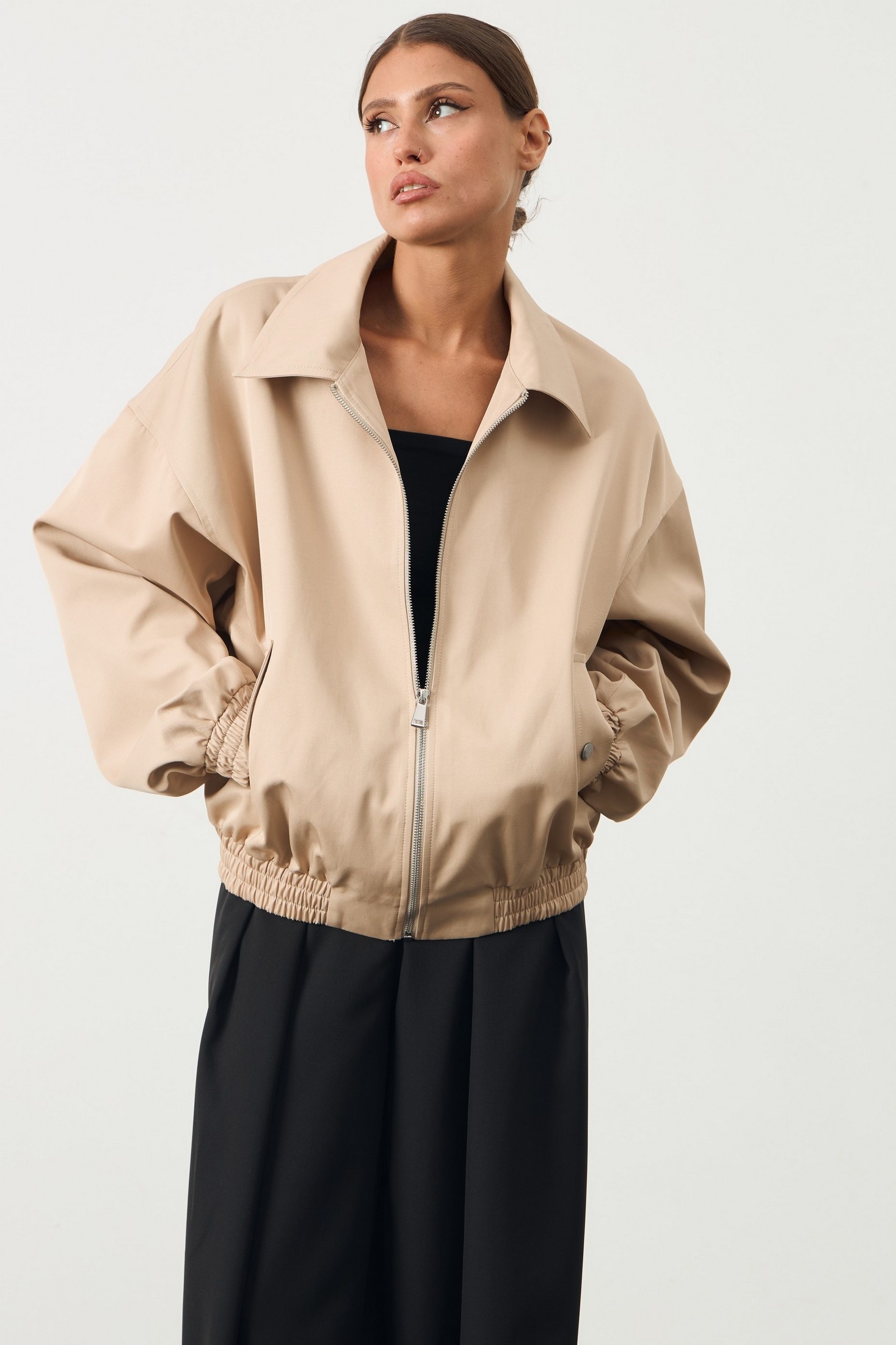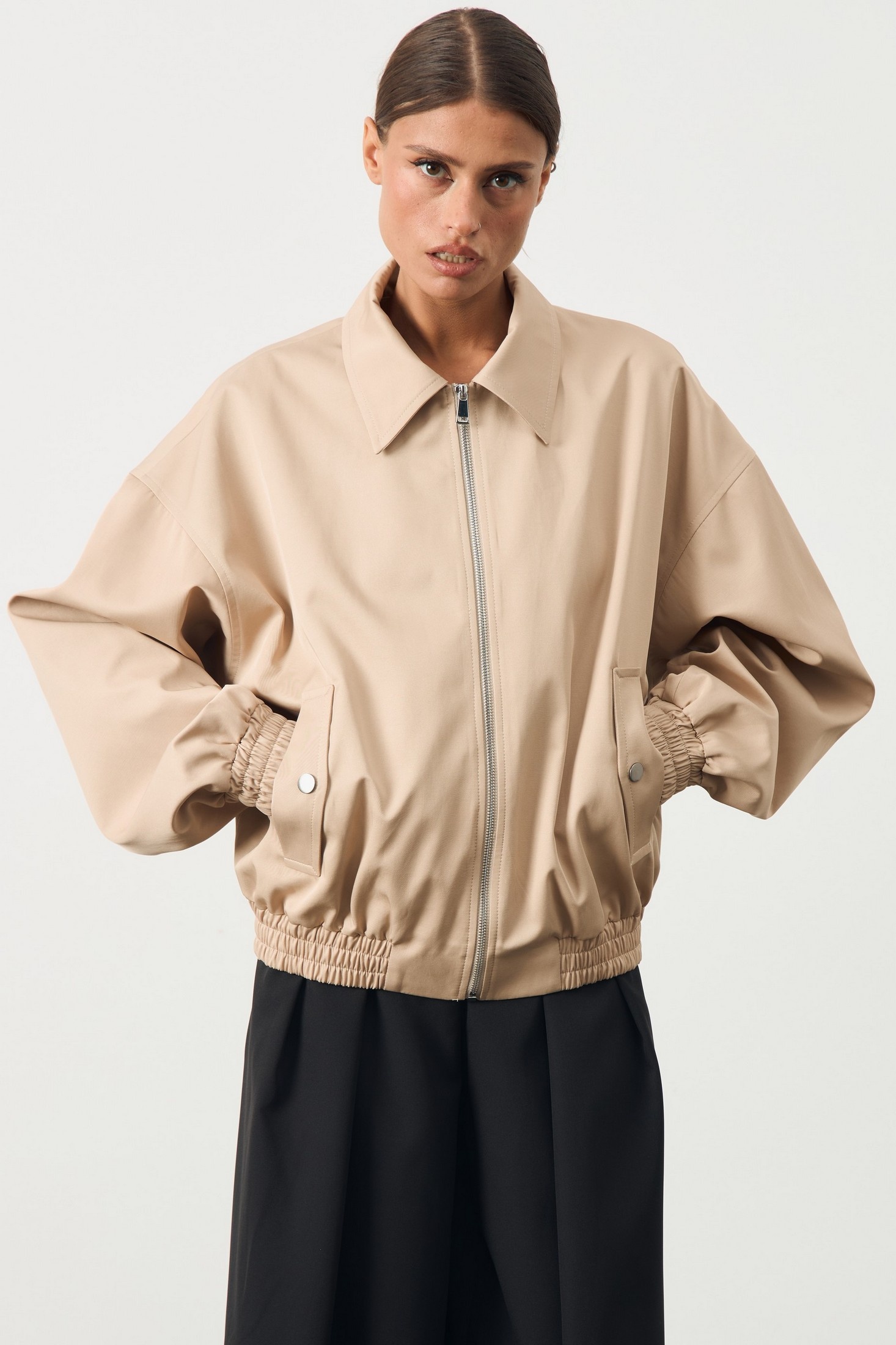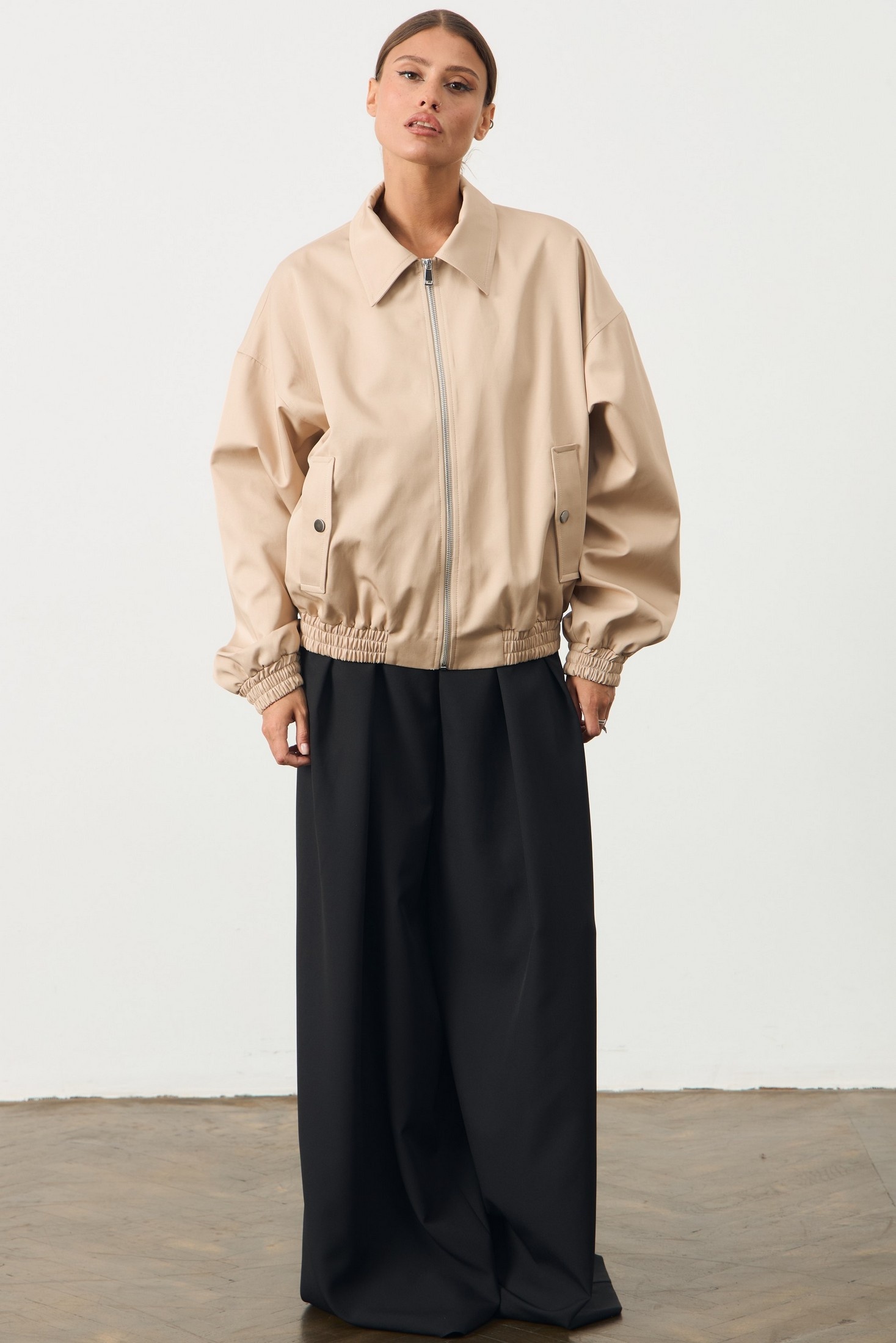 Элегантный женский бомбер светло-бежевого цвета представляет собой идеальное сочетание стиля и комфорта. Эта куртка прямого силуэта дополнена рубашечным воротником и широкими рукавами с манжетами на резинке, что добавляет изделию современный вид. Прорезные карманы с клапанами на передней части удобны для хранения мелких предметов. Особенностью дизайна является кокетка на спине, добавляющая интересный акцент. Низ бомбера обработан притачным поясом на резинке, обеспечивающим идеальную посадку. Застежка на молнии делает куртку практичной и функциональной. Этот бомбер станет стильным дополнением к любому современному гардеробу.