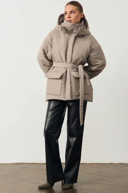 Женская осенняя куртка в нейтральном бежевом оттенке. Модель изготовлена из высококачественного водоотталкивающего материала, что обеспечивает отличную защиту от влаги. Куртка оснащена эффективным утеплителем, позволяя сохранять тепло в прохладную погоду. Дизайн дополнен съёмным капюшоном, украшенным мягкой подкладкой, что добавляет удобства и функциональности. Застежка скрыта под планкой и выполнена в виде тесьмы-молнии с кнопками, что не только удобно, но и поддерживает общий стильный вид. Куртка имеет широкий пояс, который подчеркивает талию, придавая силуэту больше изящества и женственности. Накладные карманы на передней части не только функциональны, но и вносят деталь в общий дизайн. Эта куртка — идеальный выбор для осеннего гардероба, сочетающий в себе практичность и модные тенденции.