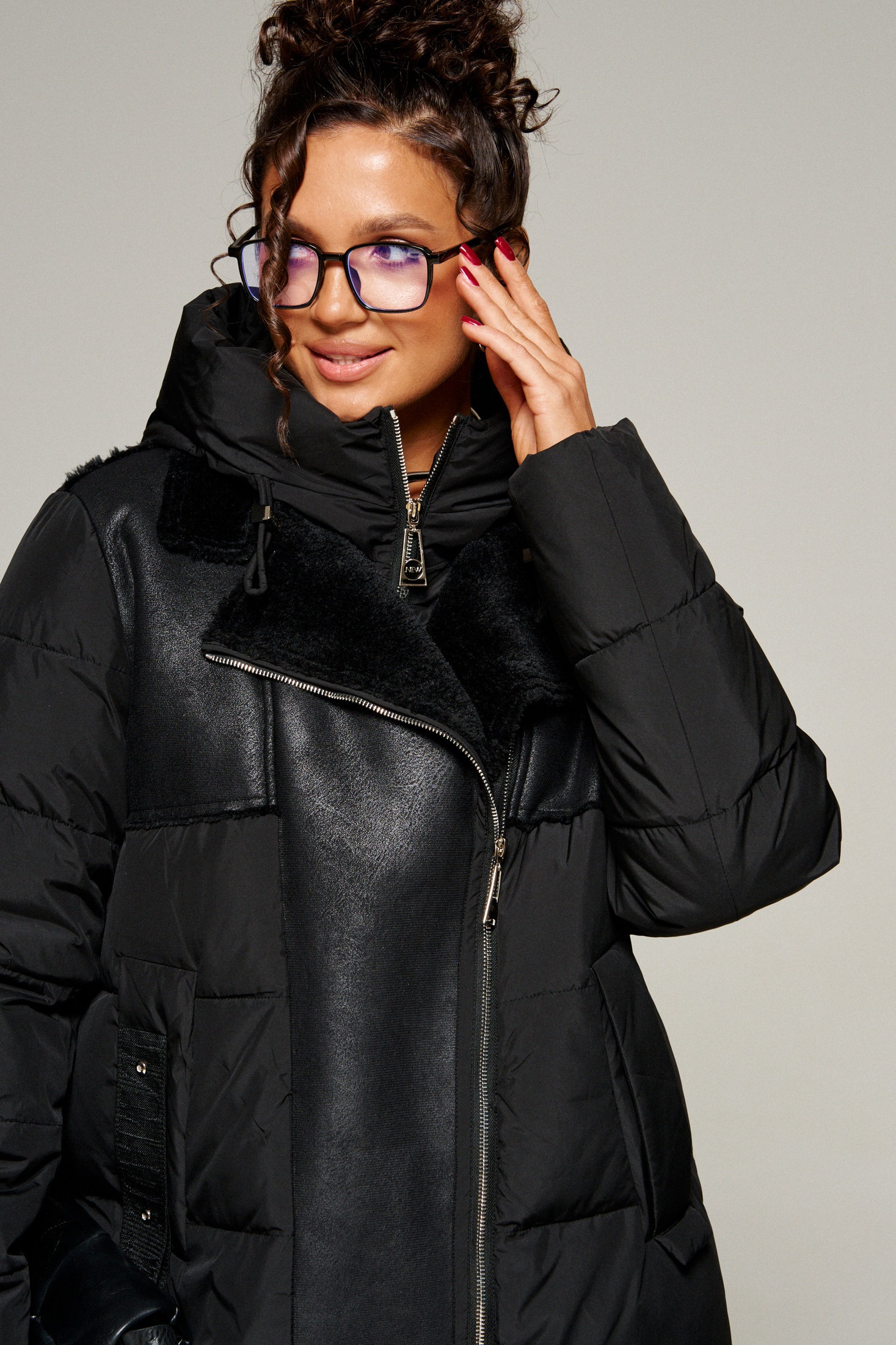 Перед с подрезной кокеткой из экокожи и с симметричными боковыми прорезными карманами с широкой обтачкой, фиксируемые на кнопку. На правом кармане выполнен декоративный элемент в виде широкой репсовой тесьмы. Центральная вставка переда, переходящая в воротник, выполнена из двусторонней экокожи, где внутренняя сторона – искусственный мех «овчина».