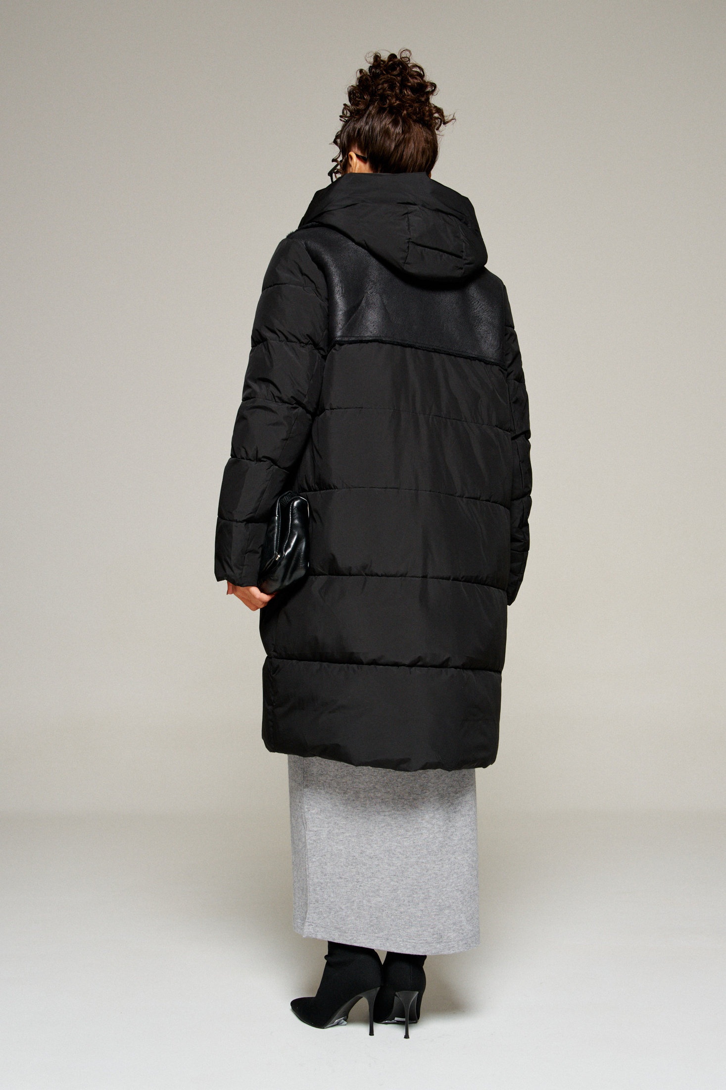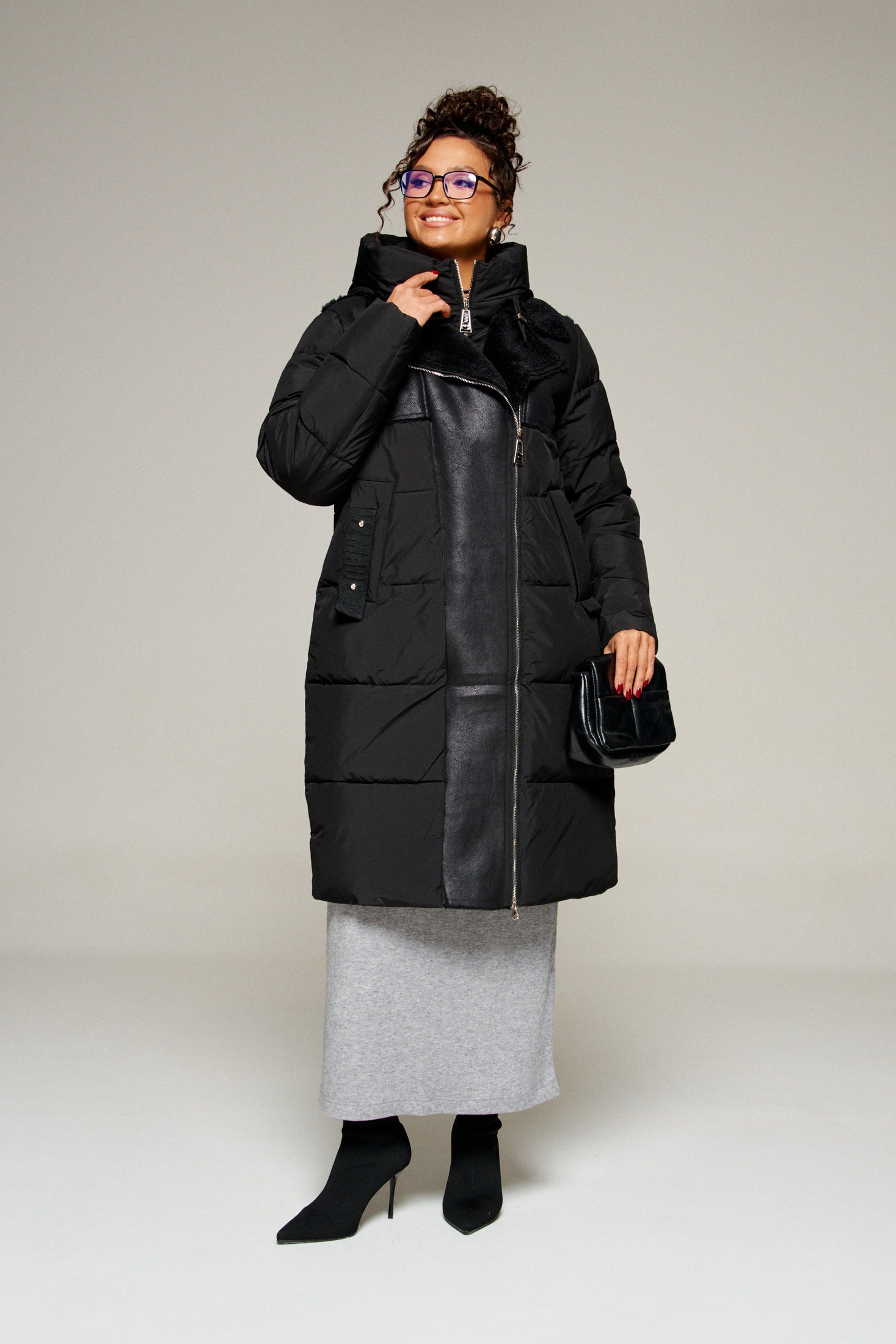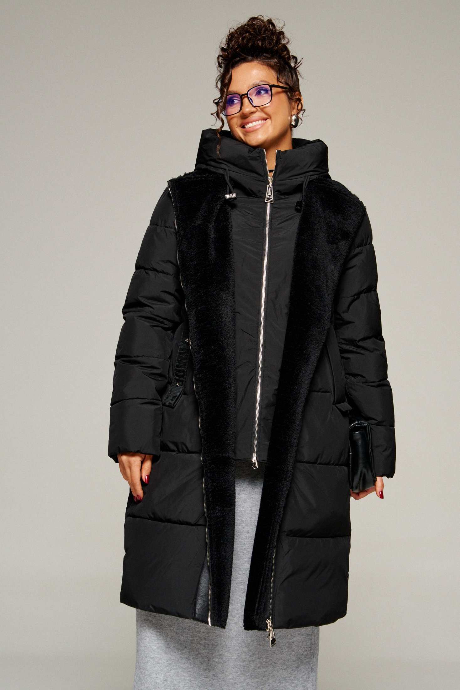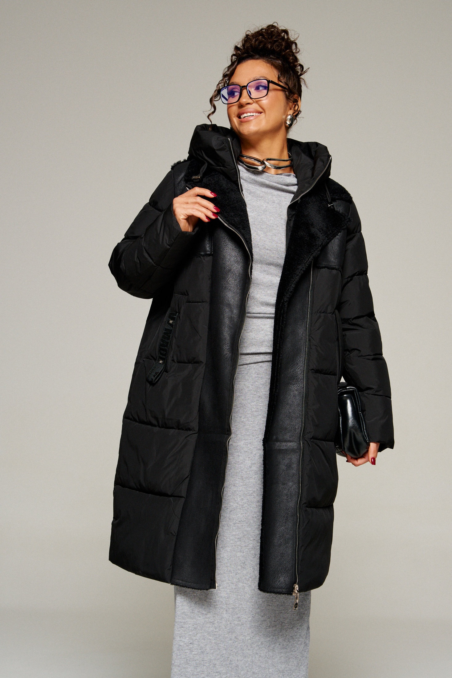 Застежка смещенная на двустороннюю молнию от верха до низа.