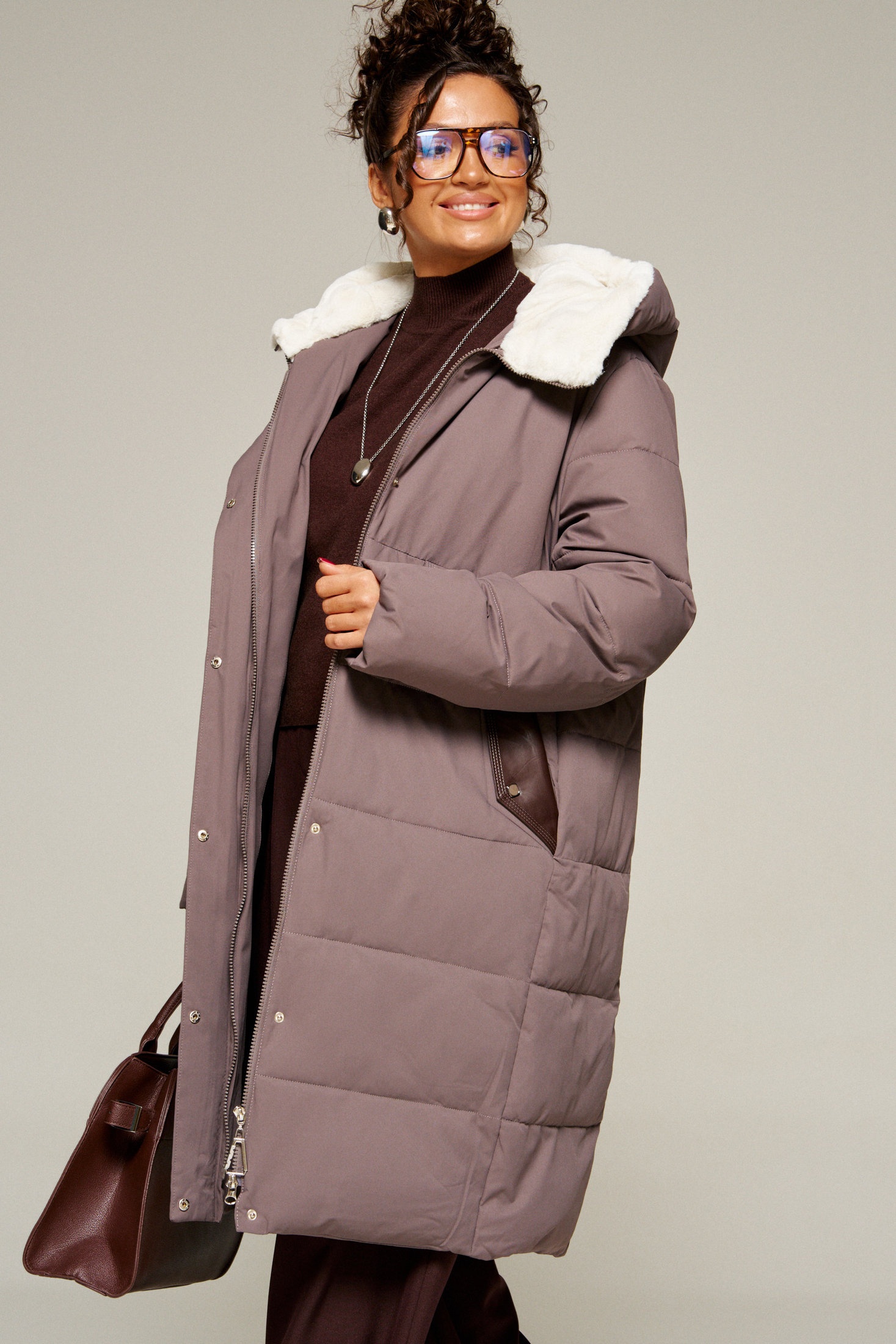 Капюшон с застежкой спереди умеренного объема. Внутренняя часть капюшона выполнена из искусственного меха, который выполняет декоративную и защитную функции, создавая дополнительное тепло и защиту от ветра и холода.
