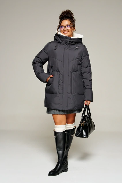 Капюшон с застежкой спереди умеренного объема. По периметру капюшона с внутренней стороны выполнена оторочка из искусственного меха, которая выполняет декоративную и защитную функции, создавая дополнительное тепло и защиту от ветра и холода.