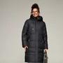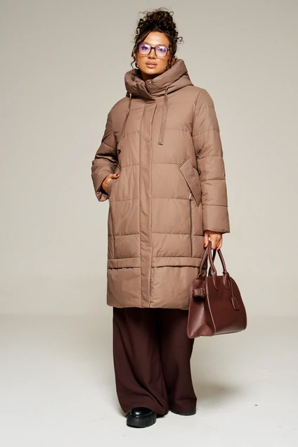 Пальто выполнено из прочной, влагостойкой и приятной на ощупь полиэстерной ткани; на синтетической подкладке. Утеплитель холлофайбер 200 г/м. кв. предназначен для использования изделия при температурном режиме от -10 до -20 градусов. Модель прямого силуэта, базового кроя; предназначена для повседневной носки. Перед с горизонтальным подрезом и мягкой складкой внизу, с симметричными боковыми прорезными карманами с широким отворотом, фиксируемые на кнопку и с вертикальными отделочными молниями до подреза. Спинка цельнокроеная. Рукав длинный втачной двухшовный. По низу внутри рукава предусмотрена дополнительная вставка в виде притачной трикотажной манжеты. Воротник – стойка. Капюшон умеренного объема. По периметру капюшона с внешней стороны вставлена тесьма с декоративными наконечниками. Застежка центральная на двустороннюю молнию от верха до низа под планкой и кнопки по краю борта. Низ изделия ровный. Подкладка гладкая с наличием внутреннего кармана слева.