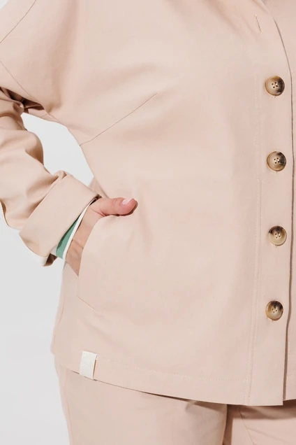 Стильный жакет-куртка, в стиле спорт- шик из хлопковой ткани. Жакет полуприлегающего силуэта, длиной до линии бедер, со спушенной линией плеча. Детали переда с кокеткой, с нагрудной вытачкой, с центральной застежкой на петли пуговицы . На боковых частях переда расположены боковые карманы . Спинка с кокеткой , средним швом. Рукава втачные с декоративными патами , придавая образу изюминку. Отличный вариант для прогулок с друзьями, выхода в свет, путешествий.