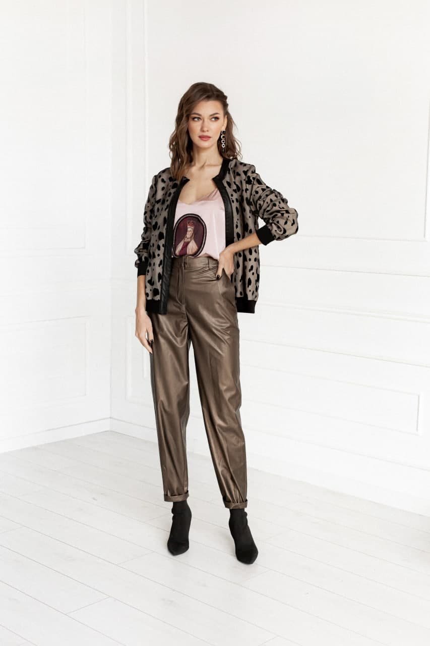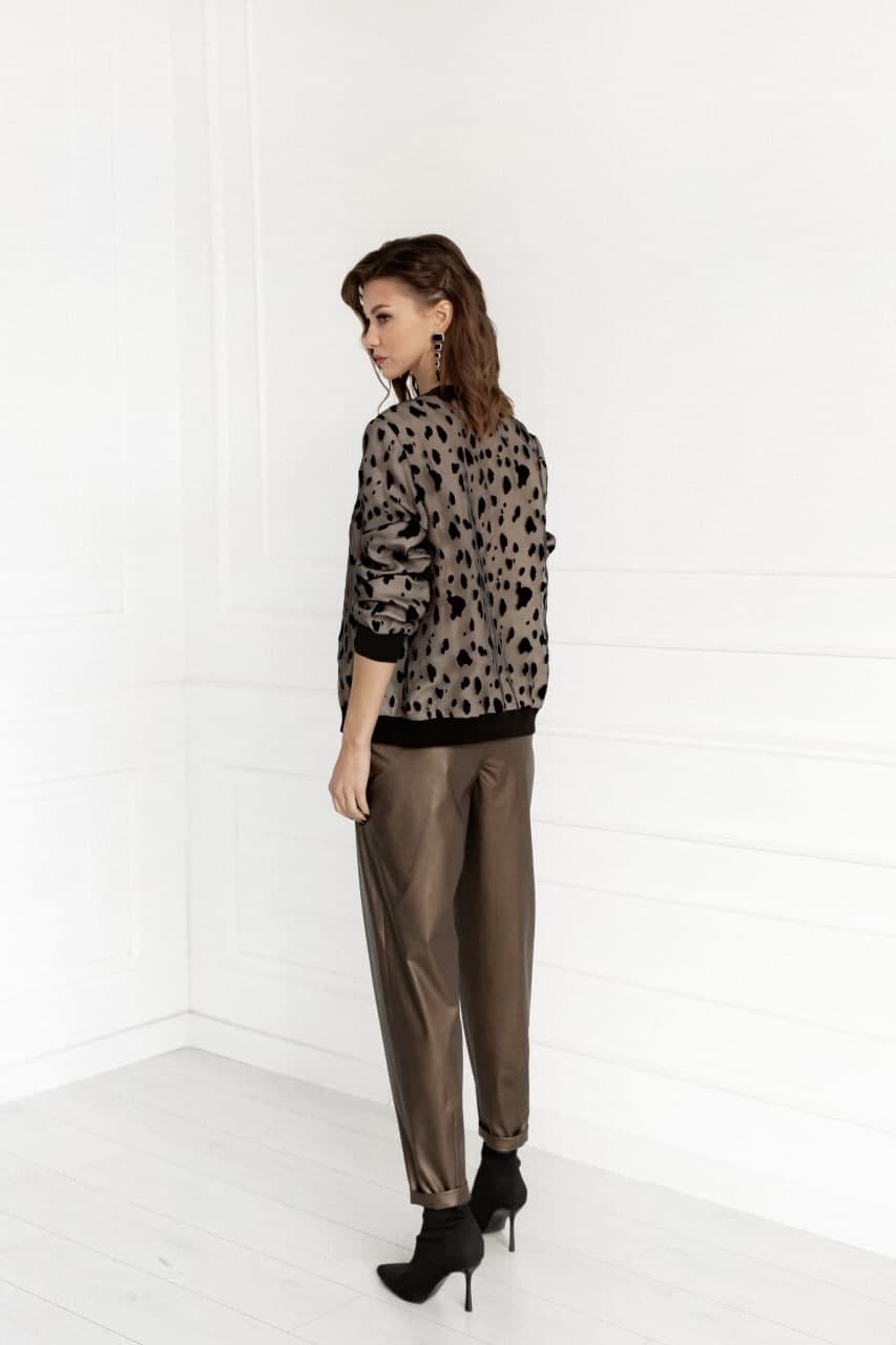 Бомбер из органзы на подкладке, с втачным рукавом, по переду с планками из отделочной ткани и застежкой молнией. По низу рукава декоративные манжеты-довязы, по низу бомбера и горловины так же эластичный довяз.