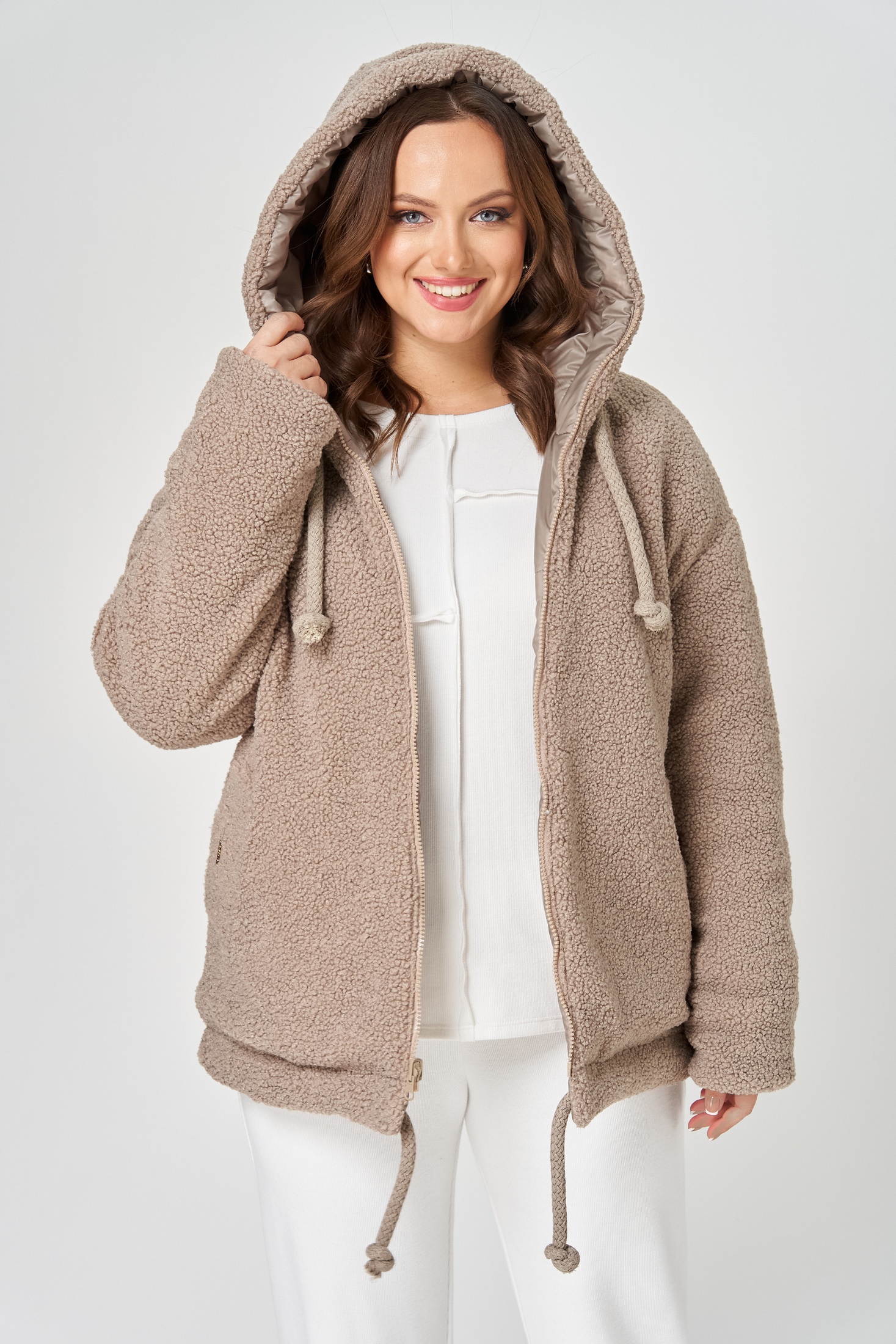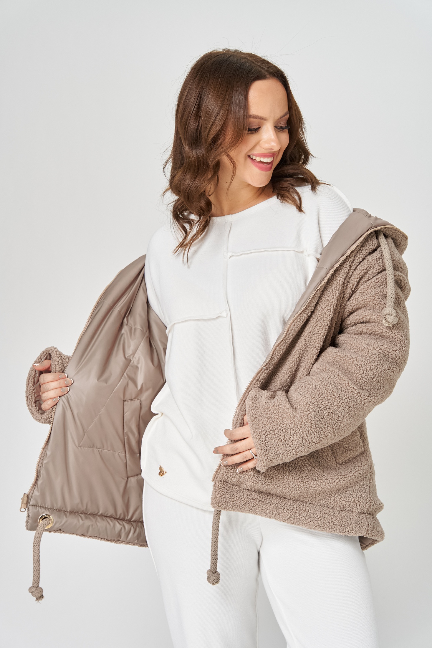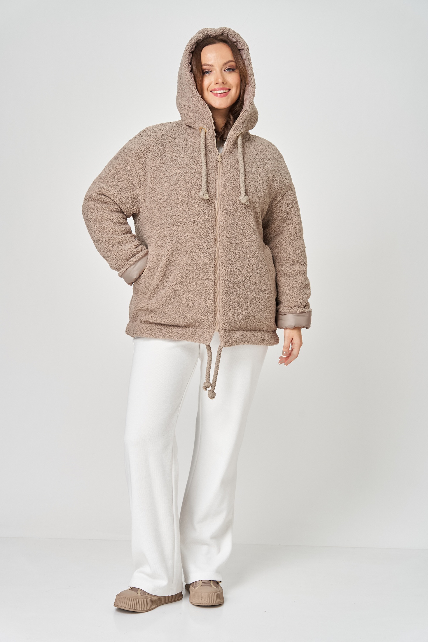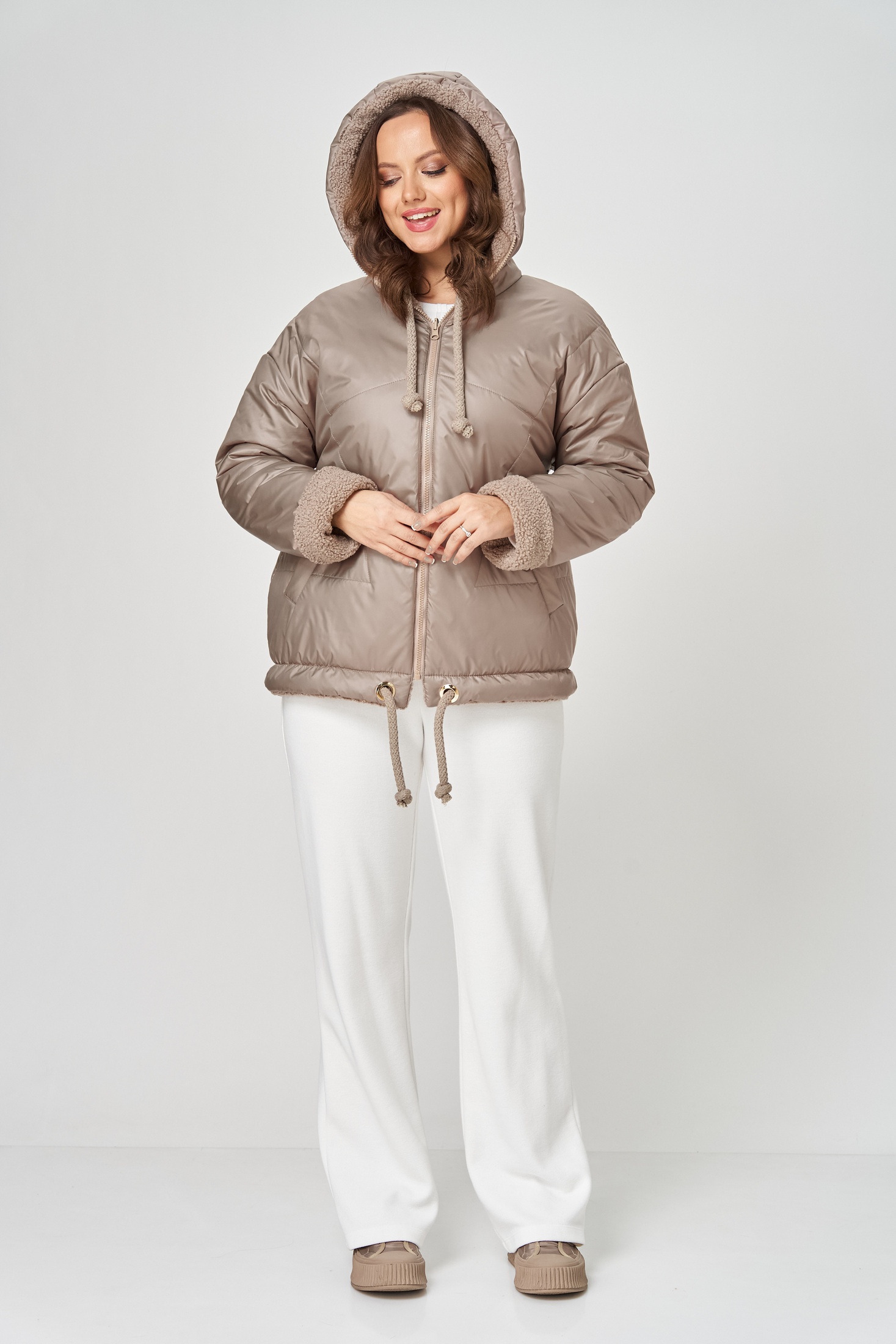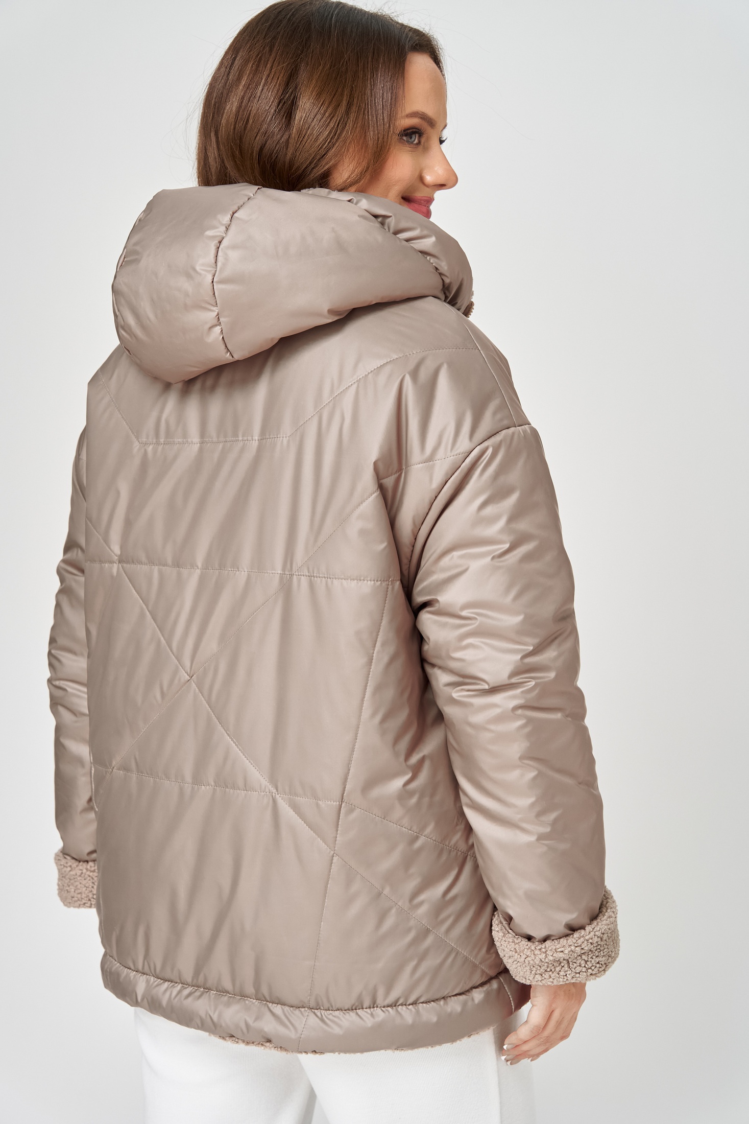 Куртка женская с центральной застёжкой на тесьму-молнию. Двусторонняя. Линия плеча спущена. Рукав втачной одношовный. По переду прорезные карманы с листочкой. Капюшон с центральной частью , по отлету-кулиса. По низу изделия - кулиса. Используется две ткани. Одна сторона простёганная плащёвка, вторая сторона искусственный мех. Длина по спинке 70 см, длина рукава 56 см.