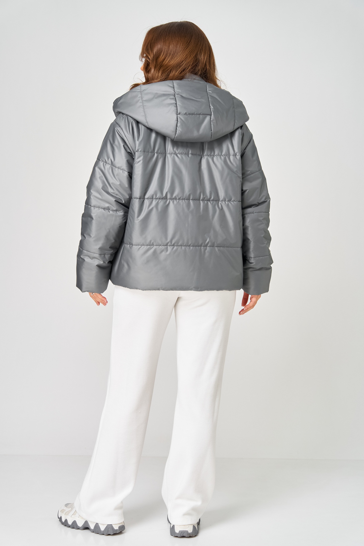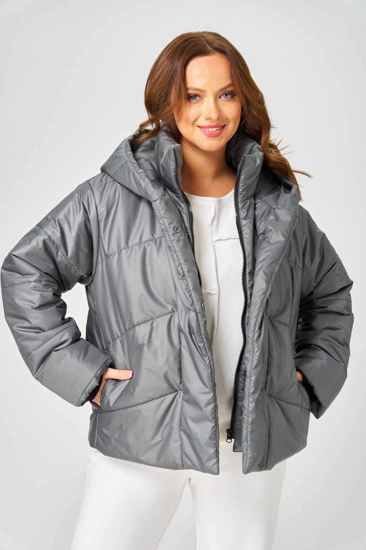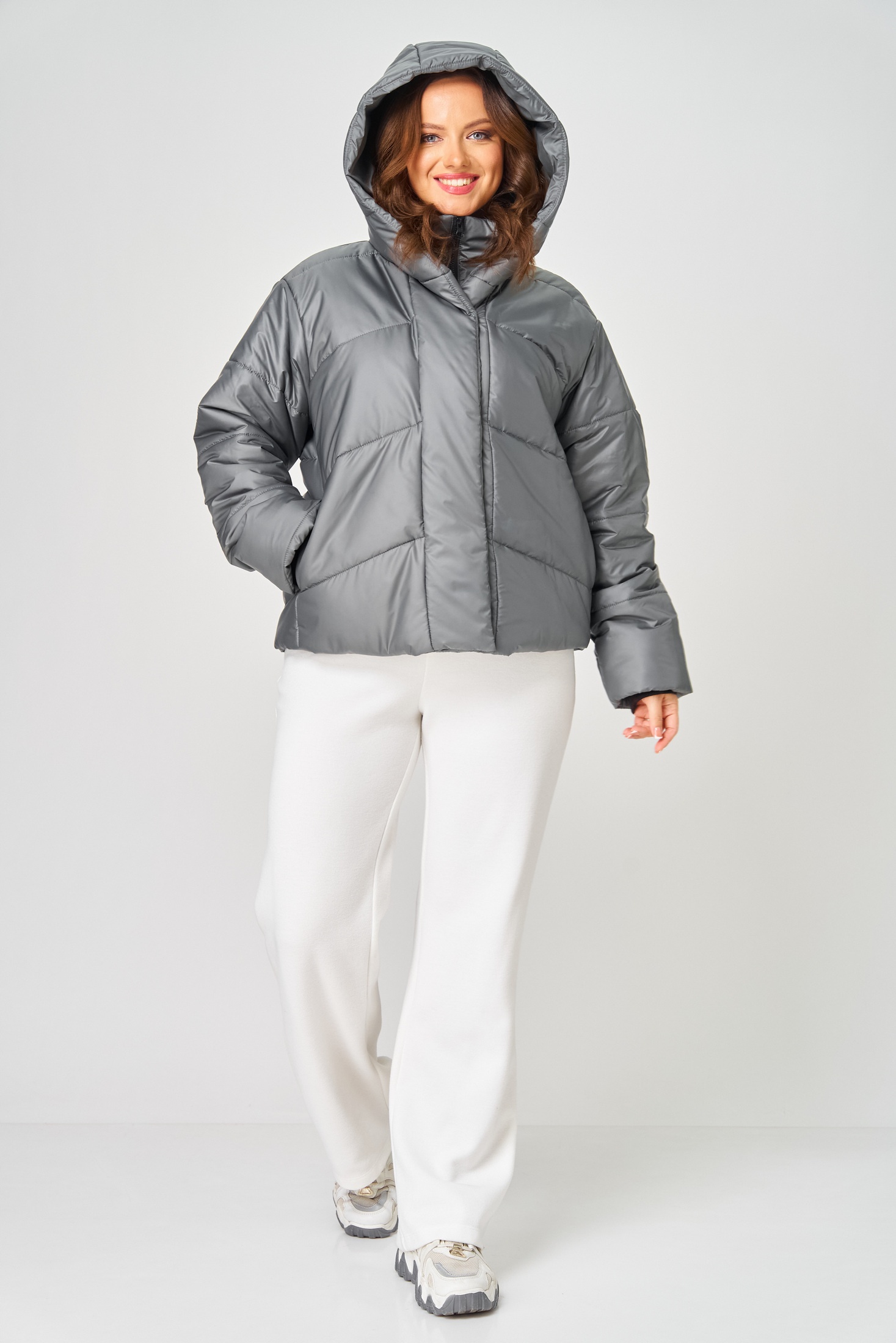 Куртка женская с центральной застёжкой на молнию и потайные кнопки. Спинка с горизонтальной стяжкой. Полочка выстегана по косой. В бококвых швах обработаны карманы. Рукав втачной одношовный с трикотажными манжетами из-под подгибки. Воротник-капюшон переходящий в планку с кнопками. Внутренний воротник-стойка с манишкой на молнии. Куртка на утеплителе. Температурный режим до - 10 градусов. Длина по спинке 63-66 см, длина рукава 60-61 см.