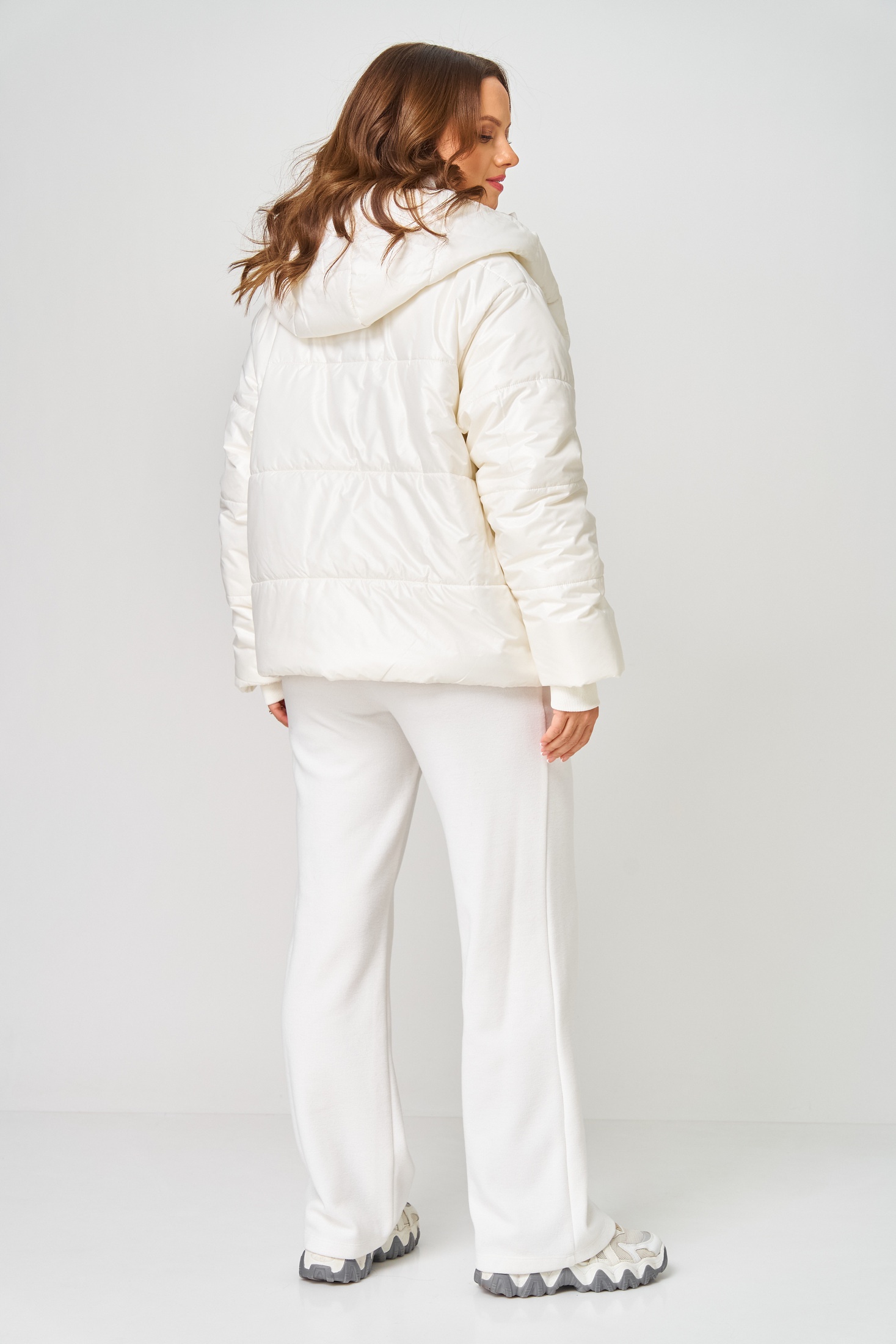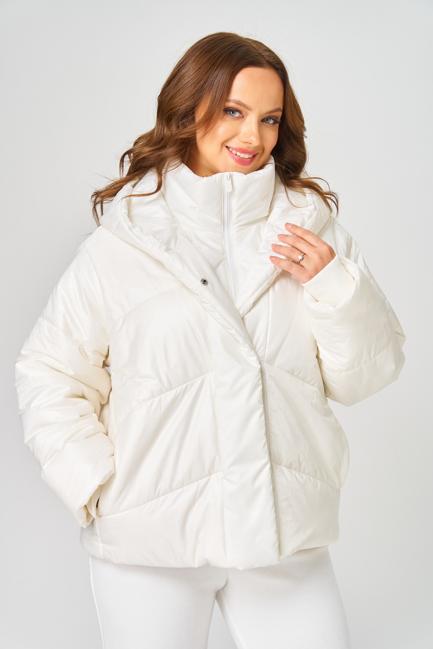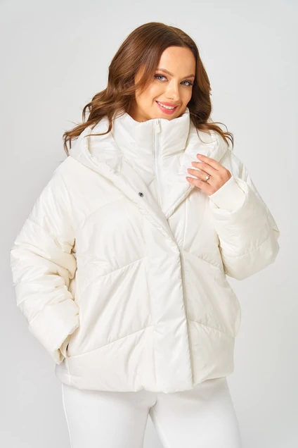 Куртка женская с центральной застёжкой на молнию и потайные кнопки. Спинка с горизонтальной стяжкой. Полочка выстегана по косой. В бококвых швах обработаны карманы. Рукав втачной одношовный с трикотажными манжетами из-под подгибки. Воротник-капюшон переходящий в планку с кнопками. Внутренний воротник-стойка с манишкой на молнии. Куртка на утеплителе. Температурный режим до - 10 градусов. Длина по спинке 63-66 см, длина рукава 60-61 см.