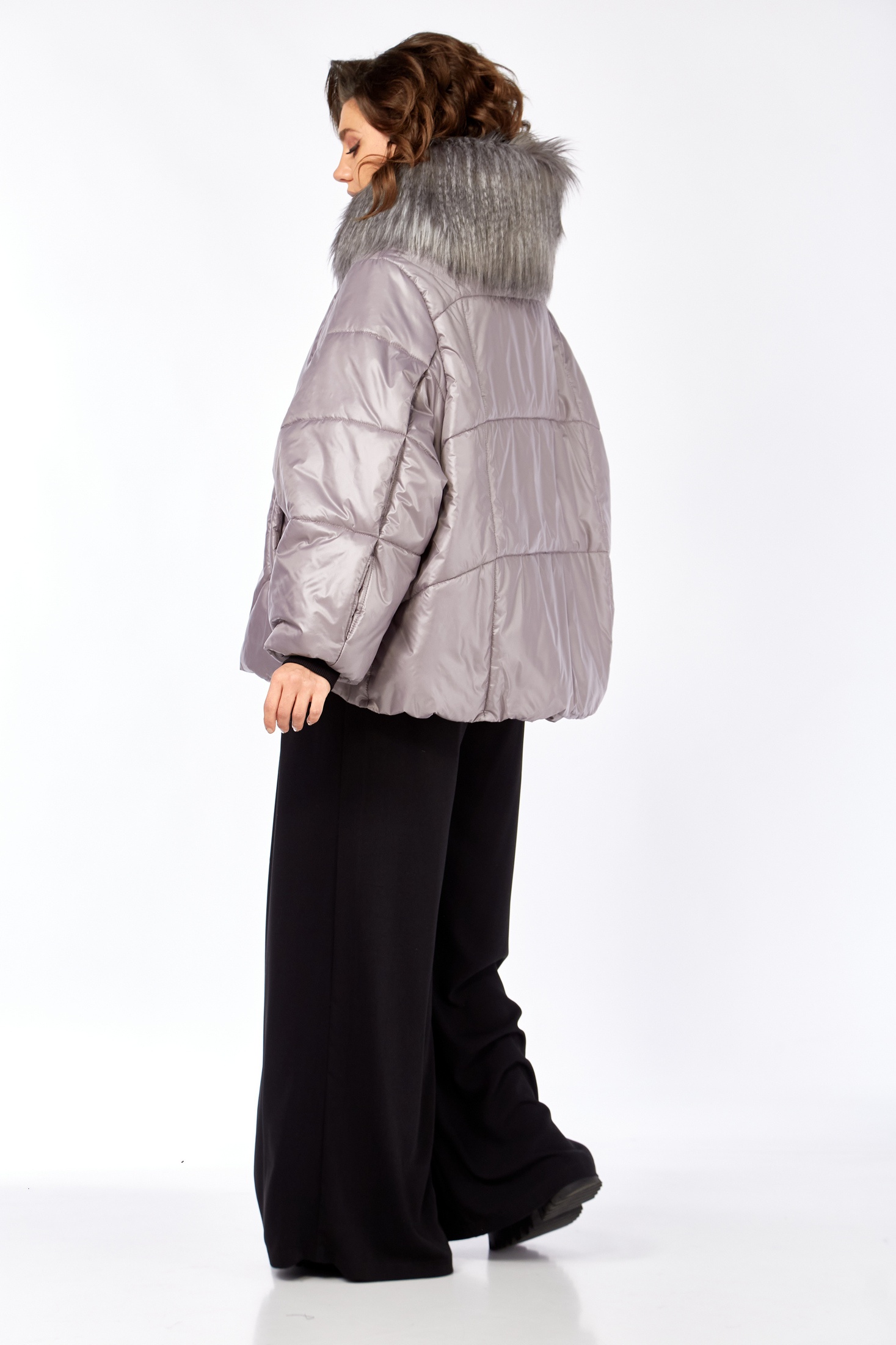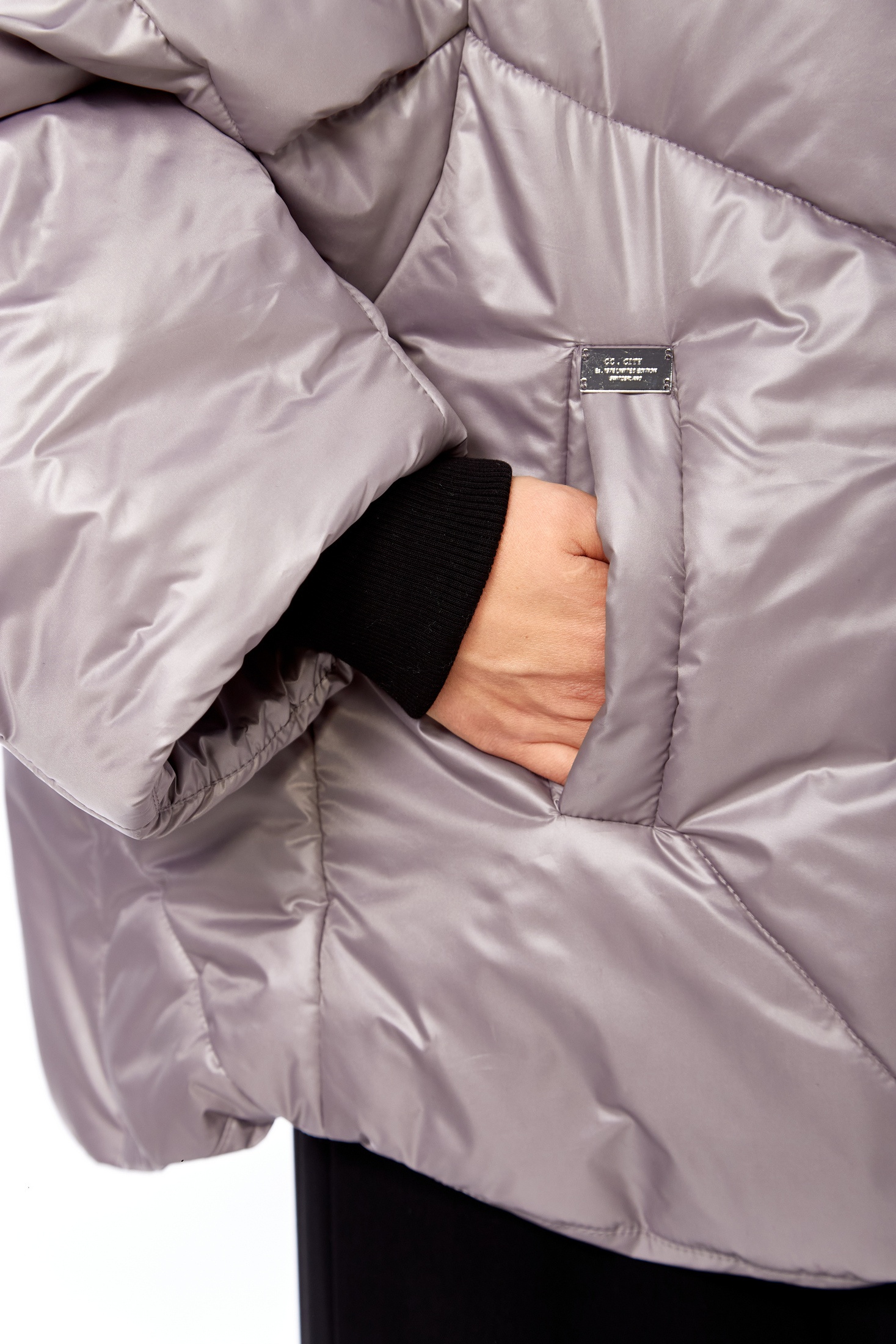 Куртка женская, свободного кроя с центральной застежкой на тесьму-молнию и кнопу-застежку на потайные кнопки. По переду прорезные карманы с втачной листочкой. Спинка присборена по низу на кулису. Рукав втачной, одношовный с застроченными складками от оката до низа по линии стяжки. Низ рукава присборен на резинку, по низу манжет из отделочной ткани-довяз. Капюшон с центральной частью и отделочной деталью по отлету, присборенной на кулису. В качестве отделки используется фурнитура. Наполнитель синтепон. Температурный режим до -10 градусов. Длина по спинке 74 см, длина рукава 58 см.