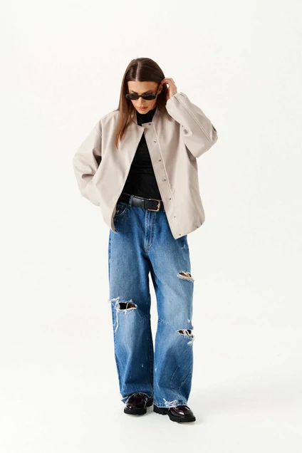 Этот бомбер из искусственной кожи представлен в элегантном бежевом цвете, отлично олицетворяющем современный городской стиль. Модель выполнена в свободном крое с спущенной линией плеча, что добавляет образу непринуждённости. Горловина округлой формы с воротником-стойкой подчёркивает изысканность модели. Основной акцент на передней части — это прорезные карманы с листочкой, придающие практичность и стиль. Комфортную посадку обеспечивает центральная застежка на потайные кнопки и подкладка. Двухшовный, втачной длинный рукав завершает изысканный вид бомбера. Эта куртка станет идеальным дополнением как для повседневных, так и для более элегантных образов.