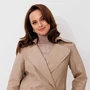 Жакет-куртка женский, укороченная, прямого силуэта на подкладке, выполнена из качественной экокожи. Застёжка двубортная на кнопки. По переду рельефы от плеча до низа и прорезные карманы с листочкой. Спинка с рельефами от плеча до низа. По низу куртки приточная планка со шлёвками, в которые продет пояс с пряжкой. Воротник отложной на стойке. Рукава двух шовные втачные, по низу паты продеты в шлёвки на кнопках.
