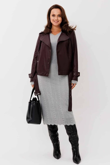 Жакет-куртка женский, укороченная, прямого силуэта на подкладке, выполнена из качественной экокожи. Застёжка двубортная на кнопки. По переду рельефы от плеча до низа и прорезные карманы с листочкой. Спинка с рельефами от плеча до низа. По низу куртки приточная планка со шлёвками, в которые продет пояс с пряжкой. Воротник отложной на стойке. Рукава двух шовные втачные, по низу паты продеты в шлёвки на кнопках.