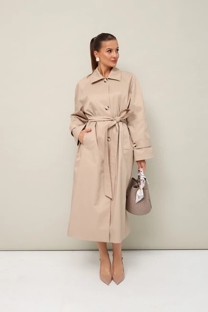 Плащ в длине миди, выполнен из ткани с водоотталкивающей и грязеотталкивающей обработкой. Силуэт слегка расширенный к низу. Отложной воротник с цельнокроеной стойкой. Центральная застёжка на петли и пуговицы. Спереди функциональные карманы-листочки. Рукава кроя реглан, по низу обработаны паты с застежкой на пуговицы. Спинка со средним швом со шлицей по низу. Плащ на подкладке. В комплекте прилагается пояс из основной ткани.