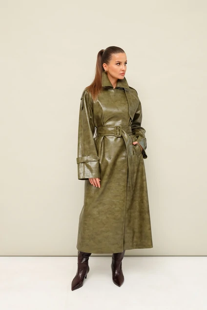 Плащ актуального прямого силуэта, выполнен из плотной экокожи с тиснением. Воротник пиджачного типа с отложными лацканами. Двубортная застёжка на петли и пуговицы. По плечевому шву обработаны погоны. Спереди отлетная кокетка и наклонные карманы с листочкой. Рукава кроя реглан, с патами по низу, с фиксацией на пуговицы. Спинка со средним швом. Для удобства движения сзади обработана шлица. Тренч на подкладке. В комплекте пояс из основной ткани с пряжкой.