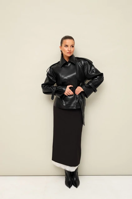 Жакет-куртка современного прямого силуэта, двубортный с застежкой на петли и пуговицы. По плечевому шву обработаны погоны. Воротник пиджачного типа с отложными лацканами. Спереди отлетная кокетка. Рукава кроя реглан, с патами по низу, с фиксацией на пряжки. Спинка со средним швом. Изделие на подкладке. В комплекте пояс из основной ткани с пряжкой.