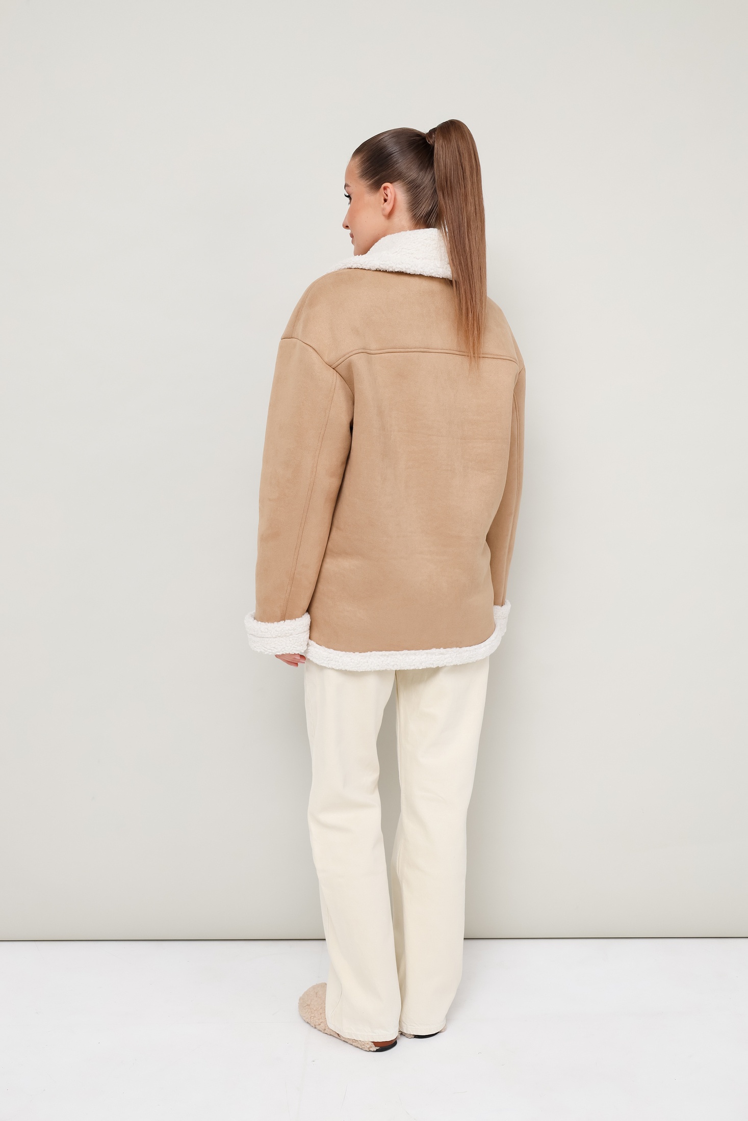 Дубленка декорирована искусственным мехом, который придает образу благородную мягкость и уют.