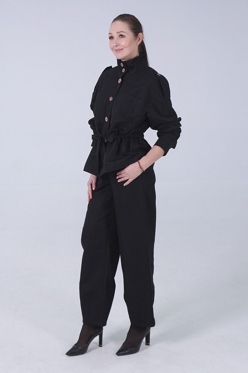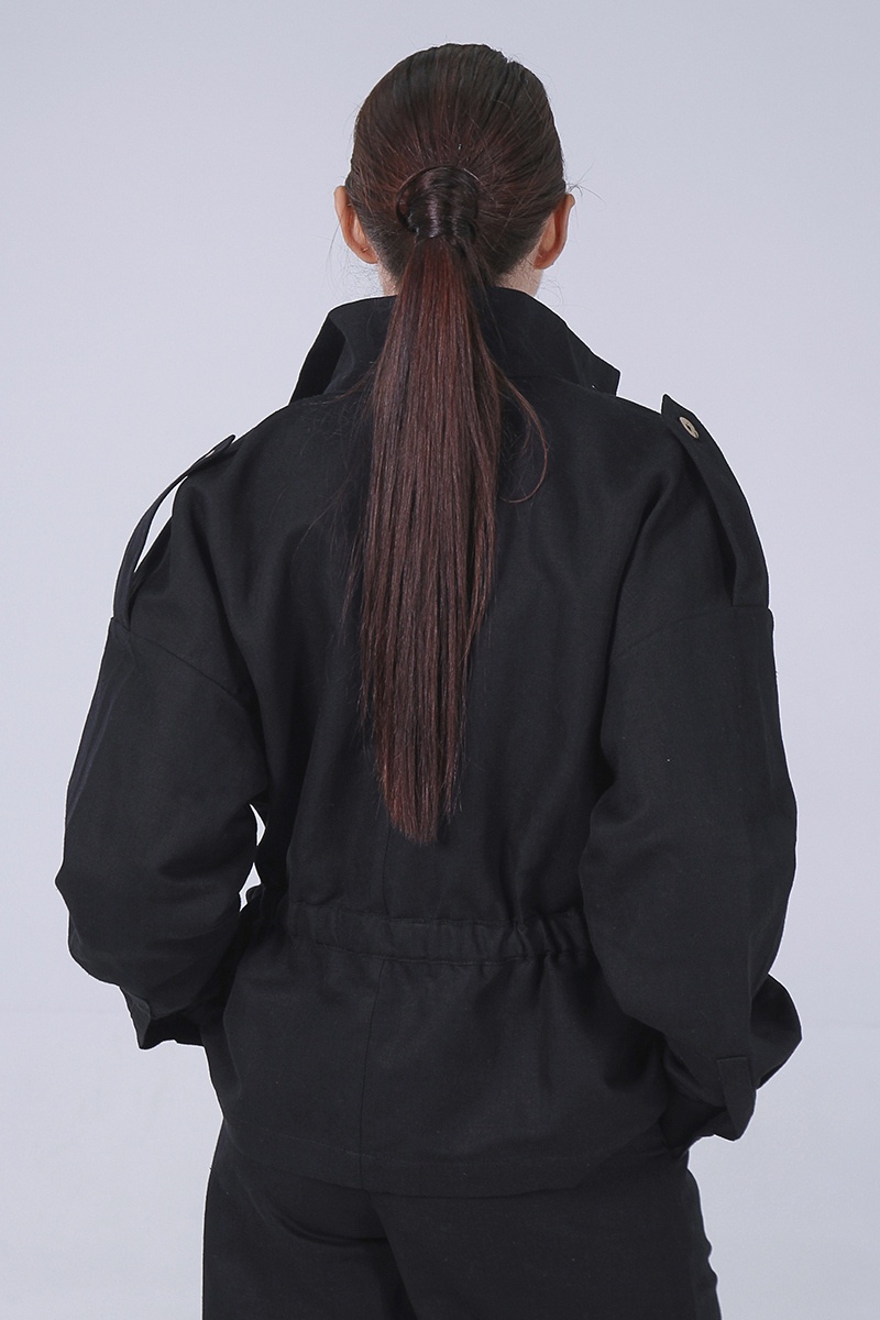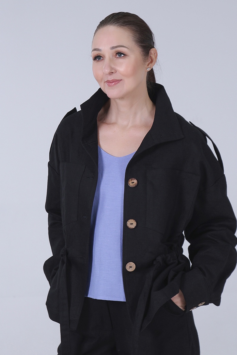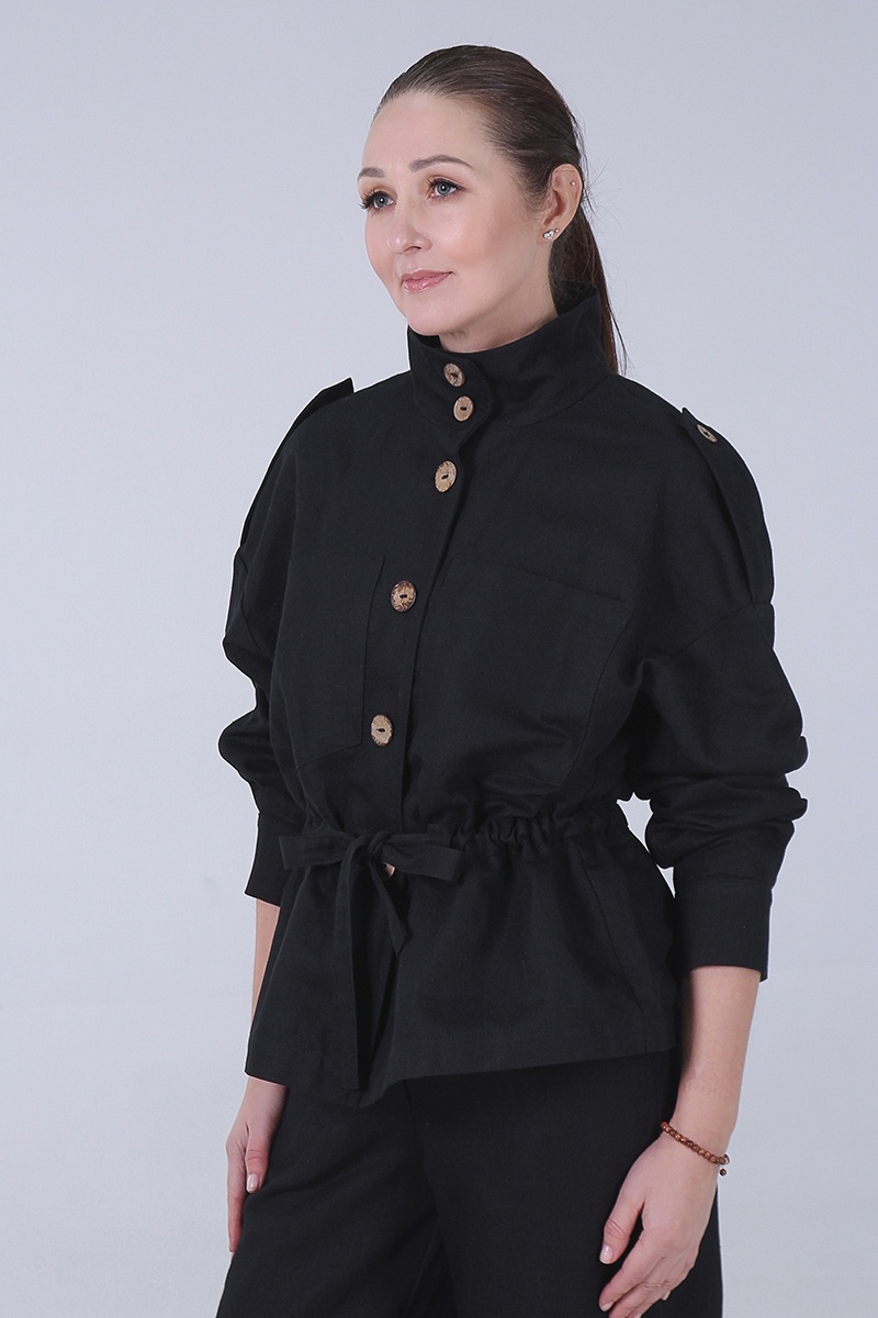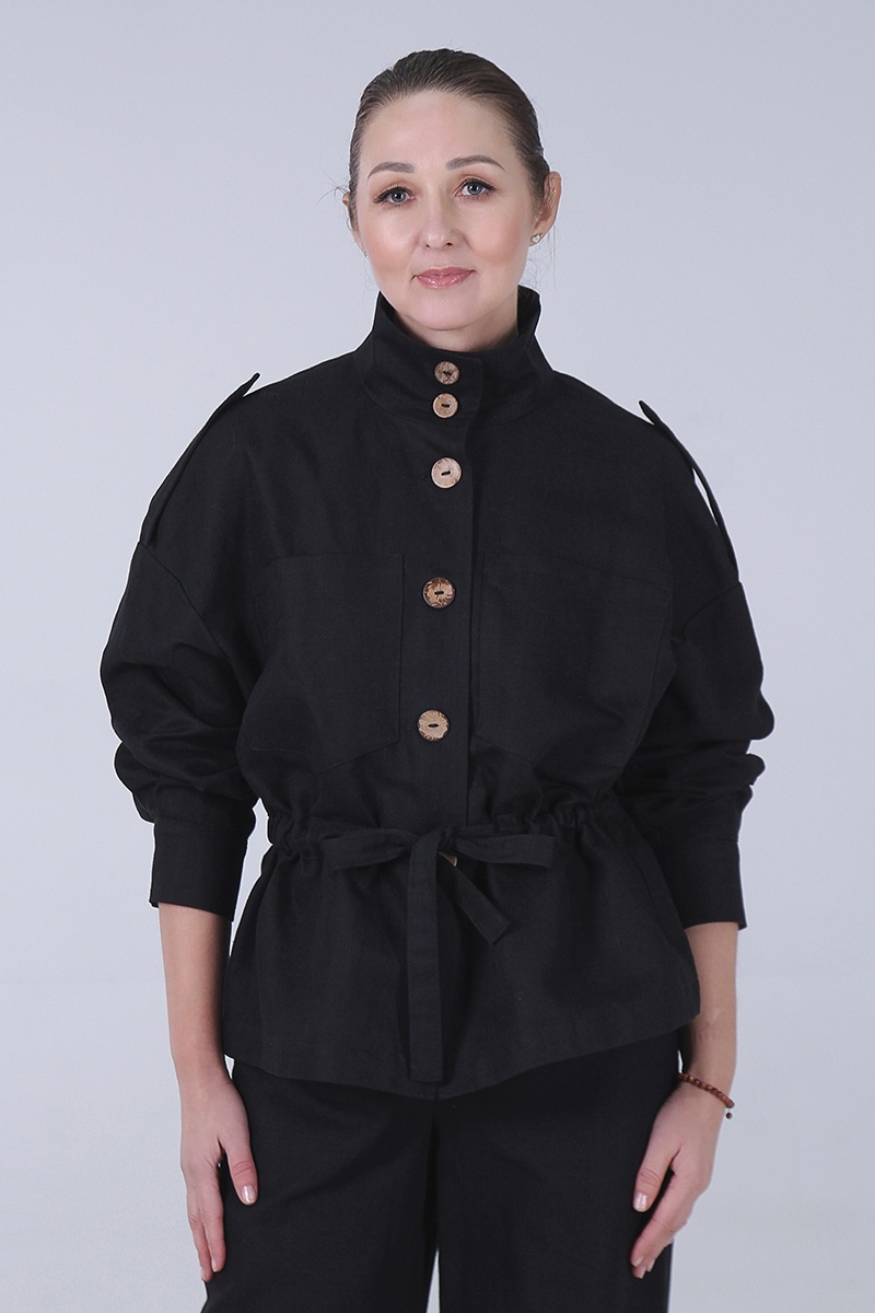 Стильная куртка выполнена из качественной льняной ткани, ткань плотная, держит форму. Воротник стойка, на плечах погоны, на талии регулировка, можно носить как в более свободном стиле, так и благодаря регулировке, создать более элегантный вариант.