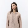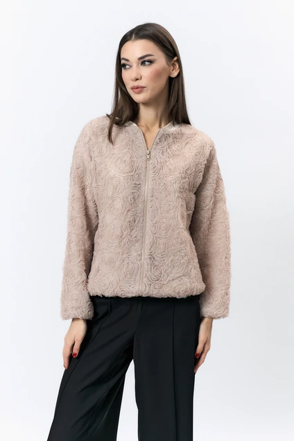 Стильный бомбер. Выполнен из текстильной ткани на подкладке. Изделие с центральной застежкой на металлическую молнию. Горловина со вставкой из отделочной ткани. Рукав спущенный. Низ рукава на резинке. По низу изделия сборка на резинку. Длина рукава 71 см, длина по спинке 60см